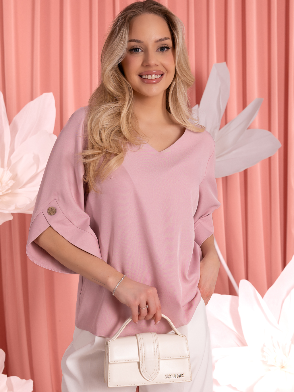 Stylowa bluzka o lekkim i kobiecym fasonie, która doskonale sprawdzi się w codziennych oraz bardziej eleganckich stylizacjach. Model posiada dekolt w serek, który subtelnie podkreśla szyję i dodaje całości elegancji. Szerokie rękawy o długości 3/4 nadają bluzce swobodnego charakteru, a ozdobny guzik na ich zakończeniu stanowi modny i efektowny detal.