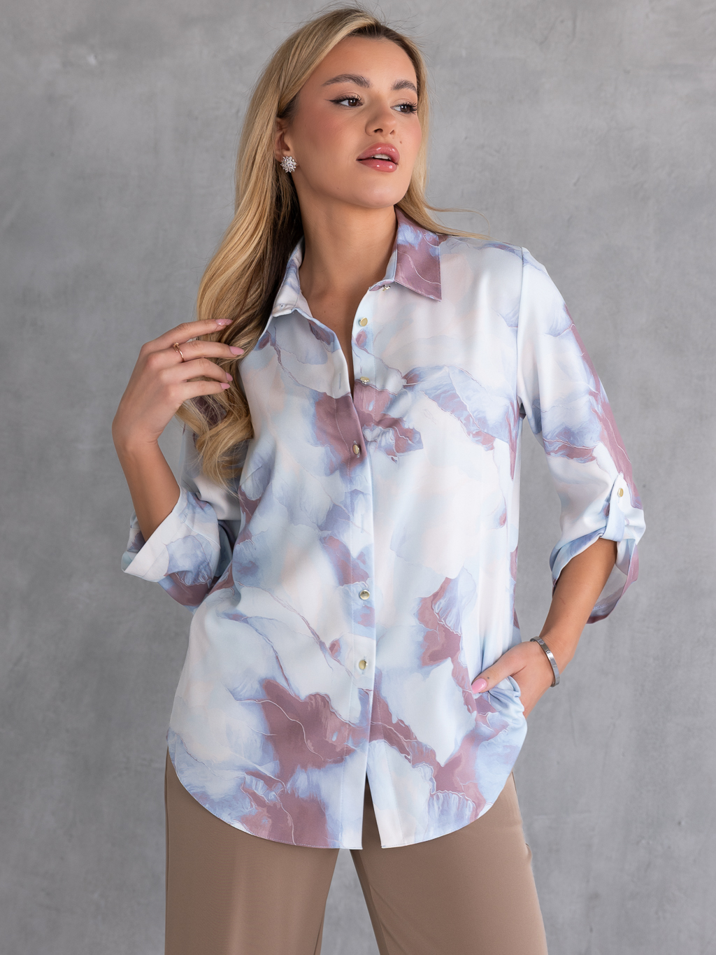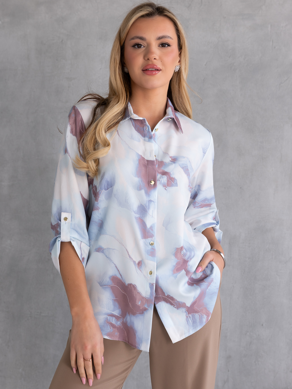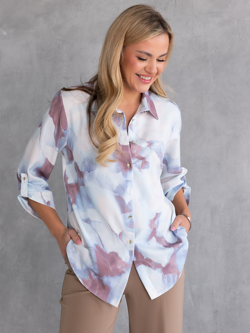 Stylowa bluzka koszulowa z podpinanymi rękawami 3/4, która łączy lekkość i elegancję w jednym. Wzór w rozmyte motywy nadaje całości artystycznego, nowoczesnego charakteru, a złote guziki dodają subtelnego szyku. Klasyczny kołnierzyk podkreśla formalny akcent koszuli, natomiast lekki, przewiewny materiał zapewnia komfort noszenia nawet w cieplejsze dni. Bluzka nieelastyczna, dzięki czemu zachowuje elegancki fason przez cały dzień. Idealna zarówno do codziennych stylizacji, jak i na eleganckie okazje.