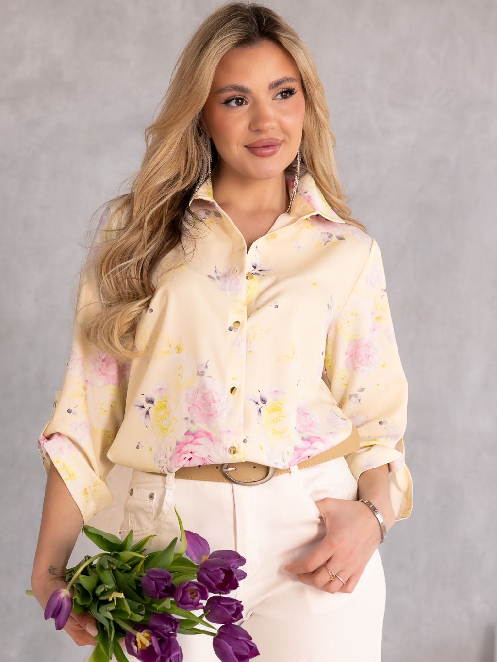 Stylowa koszula, która łączy klasyczny fason z kobiecym, kwiatowym wzorem. Model z rękawem o długości 3/4 z podpięciem pozwala na łatwe dopasowanie do stylizacji i pogody. Print w kwiaty nadaje całości świeżości i subtelnej elegancji. Złote guziki dodają szykownego akcentu, a klasyczny kołnierzyk podkreśla ponadczasowy charakter koszuli. Wykonana z nieelastycznego materiału, dzięki czemu zachowuje swój fason i estetyczny wygląd przez cały dzień.