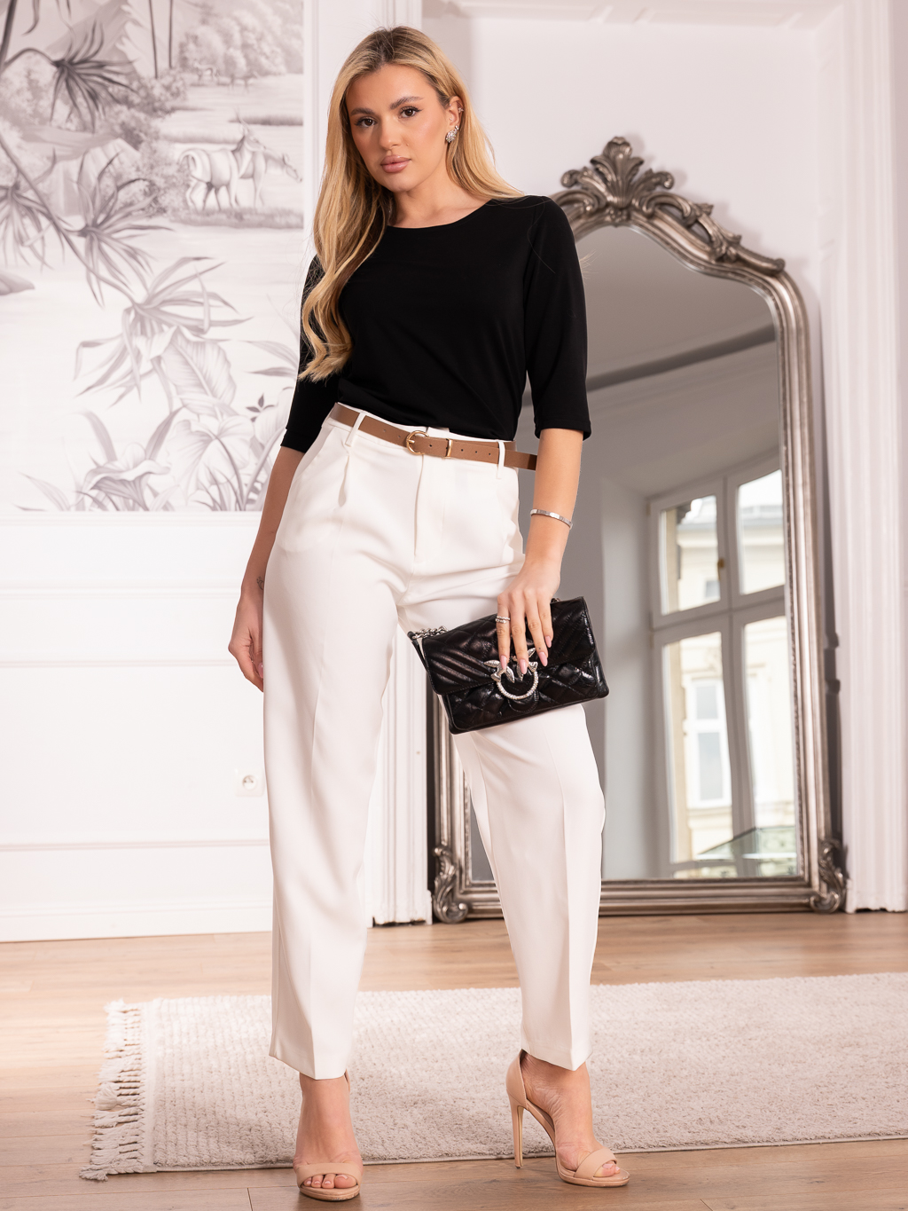 Klasyczna bluzka o ponadczasowym kroju, która doskonale sprawdzi się w wielu stylizacjach. Rękaw o długości 3/4 zapewnia wygodę i subtelną elegancję, a okrągły dekolt podkreśla prosty, klasyczny charakter modelu. Bluzka pięknie układa się na sylwetce i stanowi doskonałą bazę do stylizacji.