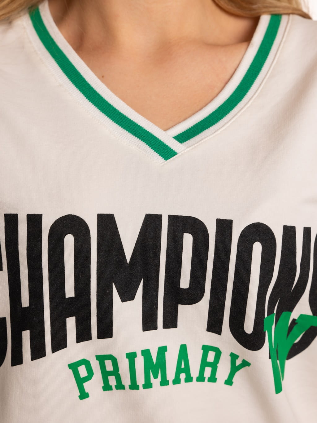 Modna, bawełniana bluza damska wkładana przez głowę, z rękawem długości 3/4. Bluza o fasonie klasycznym z dekoltem typu V-neck - w serek. Formą ozdobną jest nadruk oraz taśmy na dekolcie oraz zakończeniach rękawów.