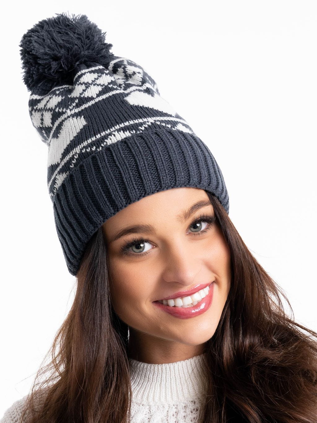Modna, ciepła czapka damska z pomponem. Formą ozdobą są białe serduszka oraz figury geometryczne. Dodatkowo czapka od środka posiada wszyte futerko.