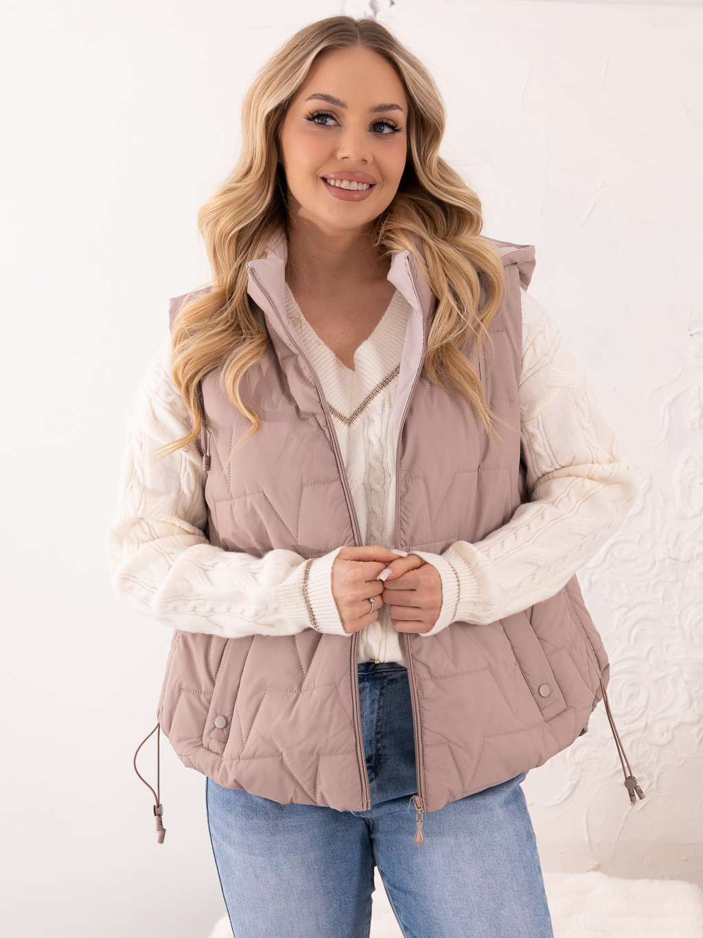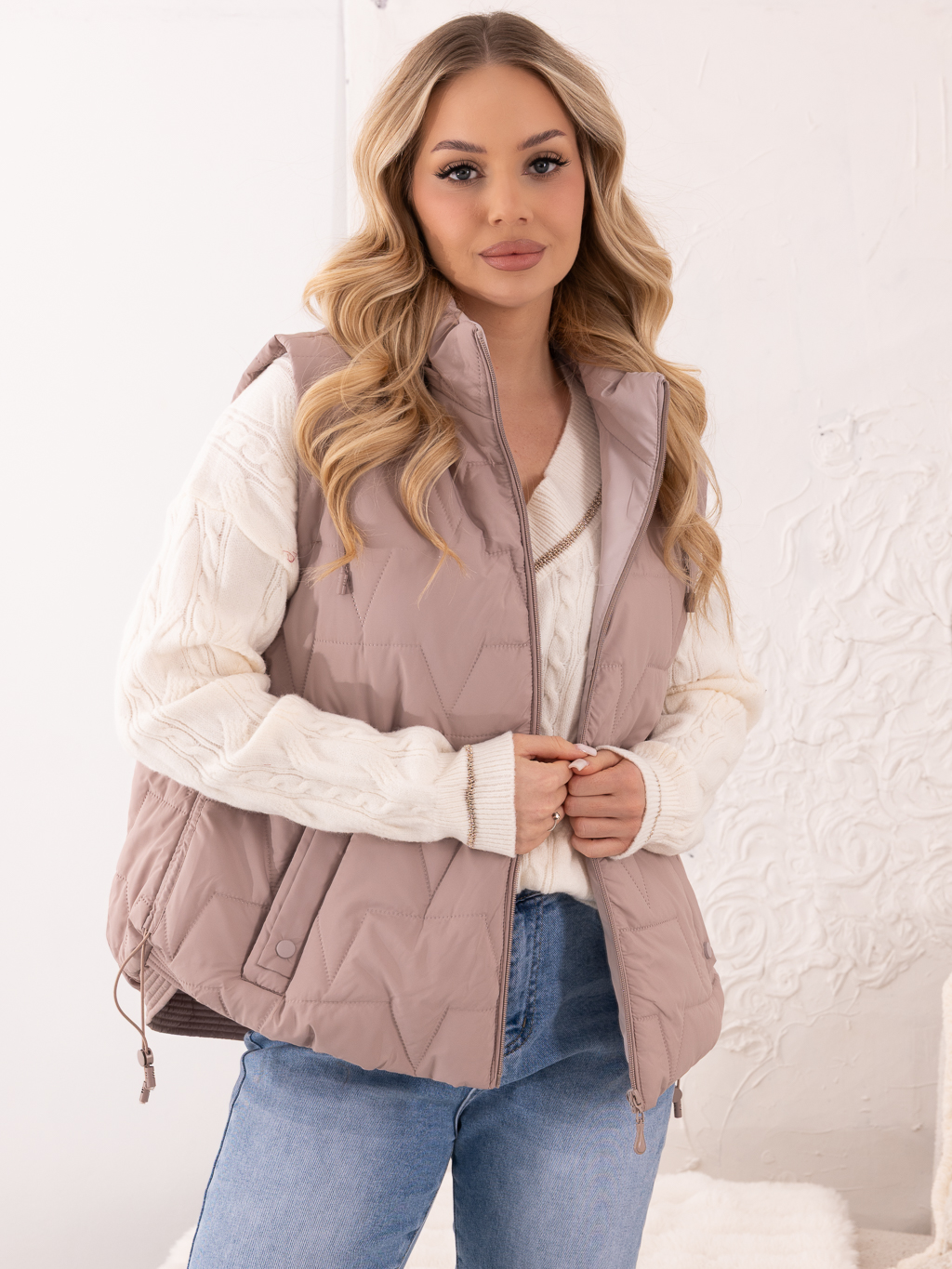 Lekka, a jednocześnie praktyczna kamizelka, świetnie sprawdzi się jako uzupełnienie codziennych stylizacji. Modne pikowanie w ząbki nadaje jej nowoczesnego charakteru, a kaptur zapewnia ochronę przed wiatrem i chłodem. Bezrękawnik posiada ściągacze wzdłuż boków, które podkreślają sylwetkę i zwiększają komfort noszenia. Praktyczne kieszenie pozwalają na wygodne przechowywanie drobiazgów. Kamizelka idealnie komponuje się zarówno z bluzą, swetrem, jak i lekką kurtką, tworząc stylowy i funkcjonalny look na sezon przejściowy.