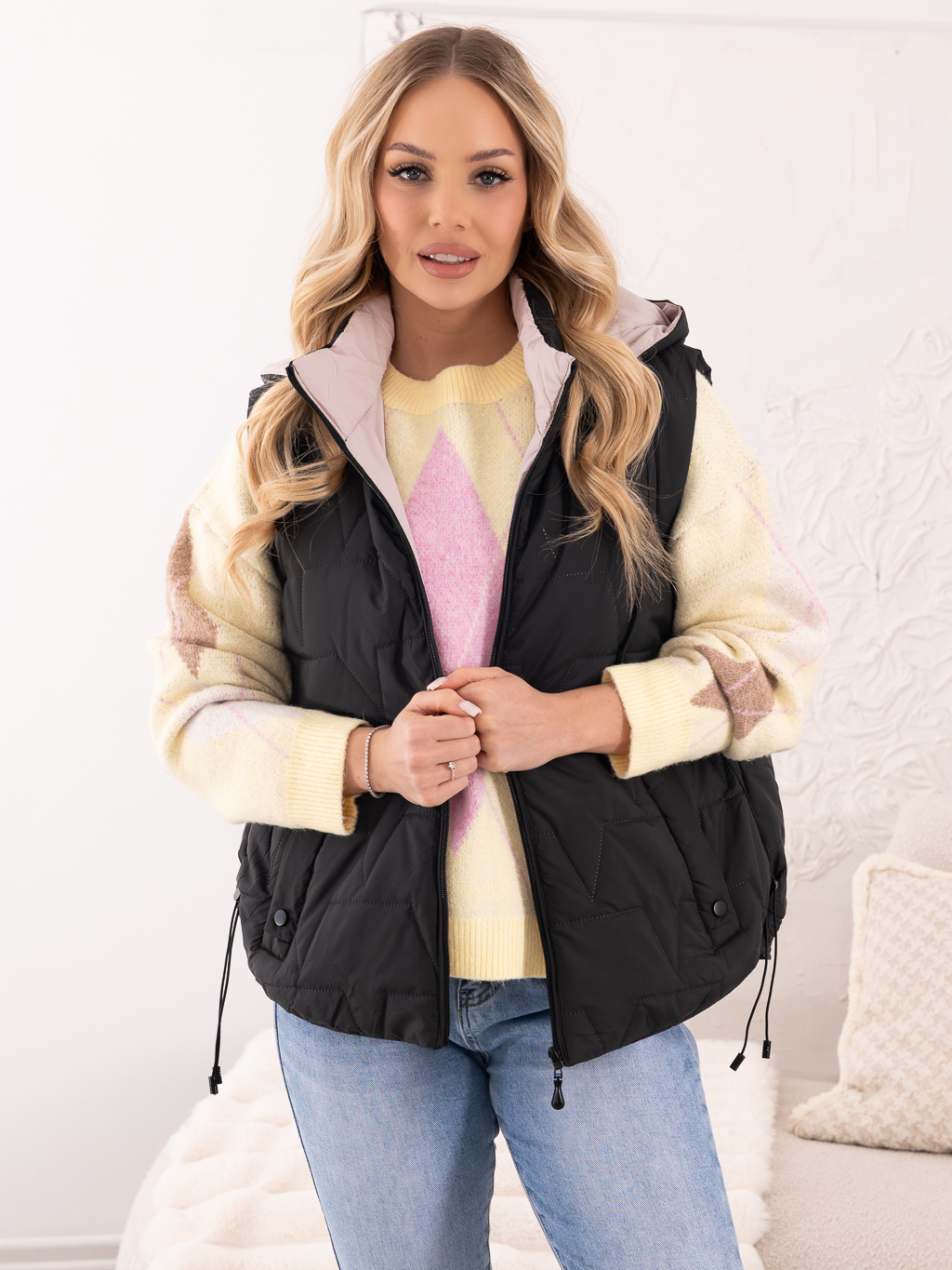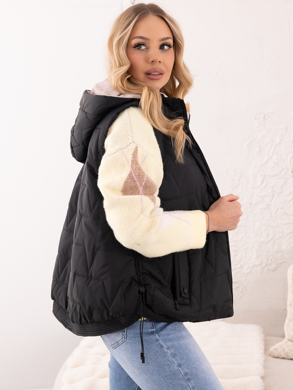 Lekka, a jednocześnie praktyczna kamizelka, świetnie sprawdzi się jako uzupełnienie codziennych stylizacji. Modne pikowanie w ząbki nadaje jej nowoczesnego charakteru, a kaptur zapewnia ochronę przed wiatrem i chłodem. Bezrękawnik posiada ściągacze wzdłuż boków, które podkreślają sylwetkę i zwiększają komfort noszenia. Praktyczne kieszenie pozwalają na wygodne przechowywanie drobiazgów. Kamizelka idealnie komponuje się zarówno z bluzą, swetrem, jak i lekką kurtką, tworząc stylowy i funkcjonalny look na sezon przejściowy.