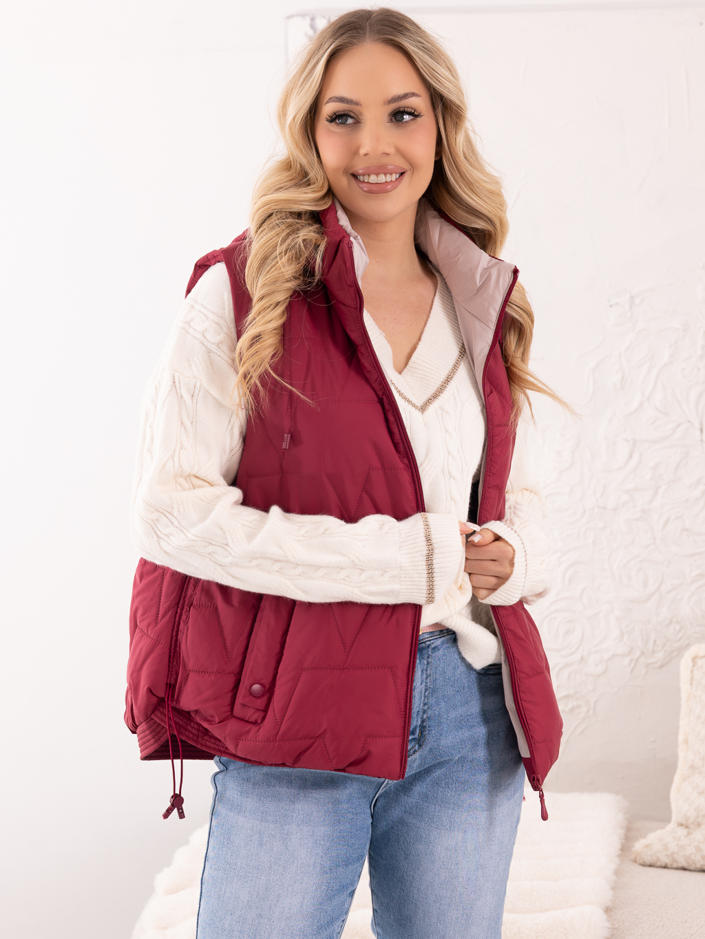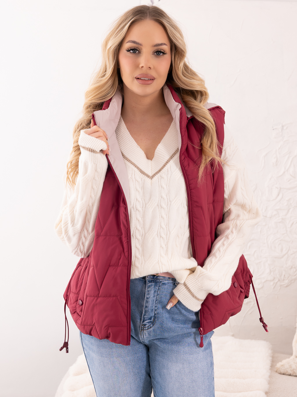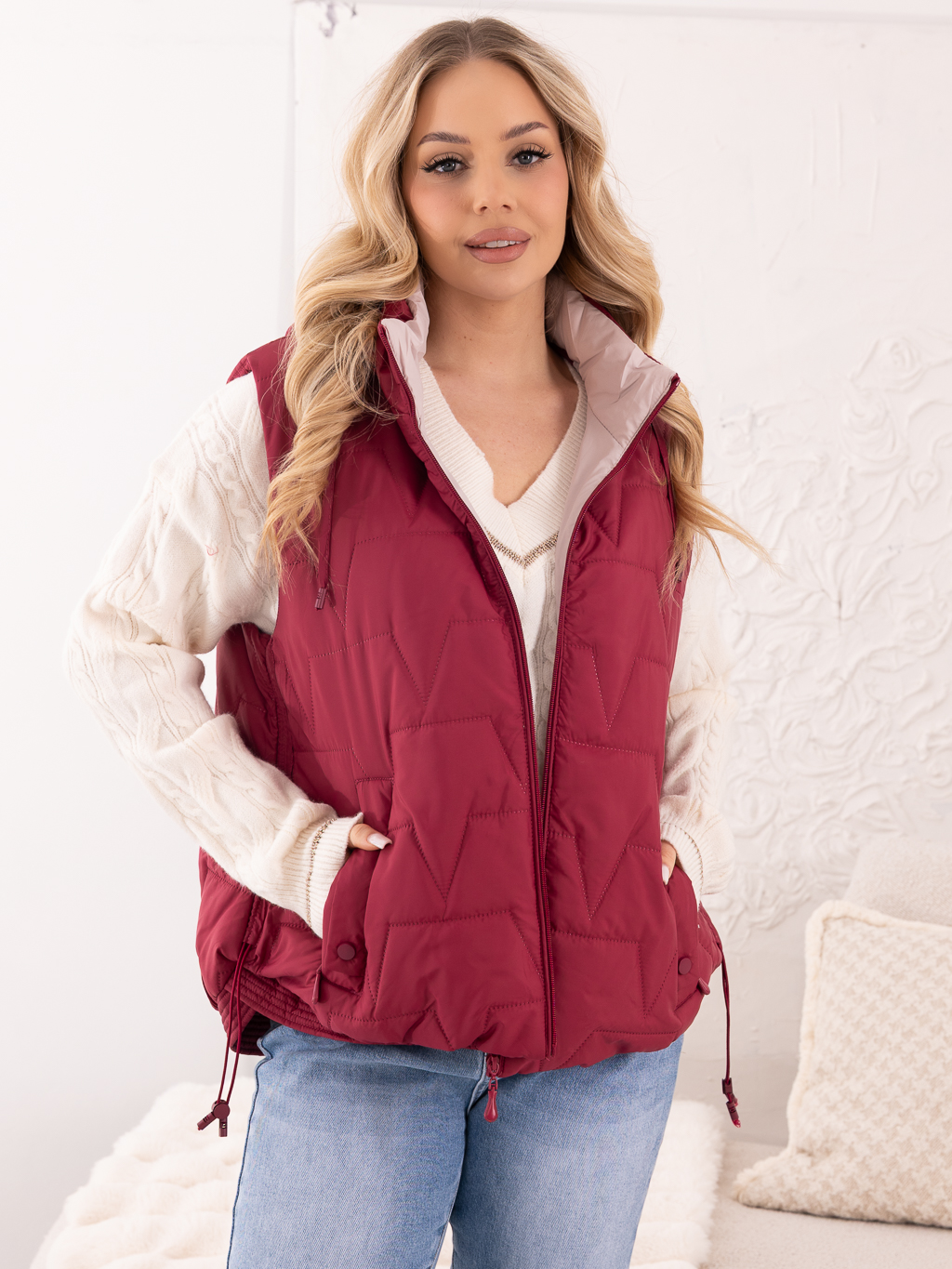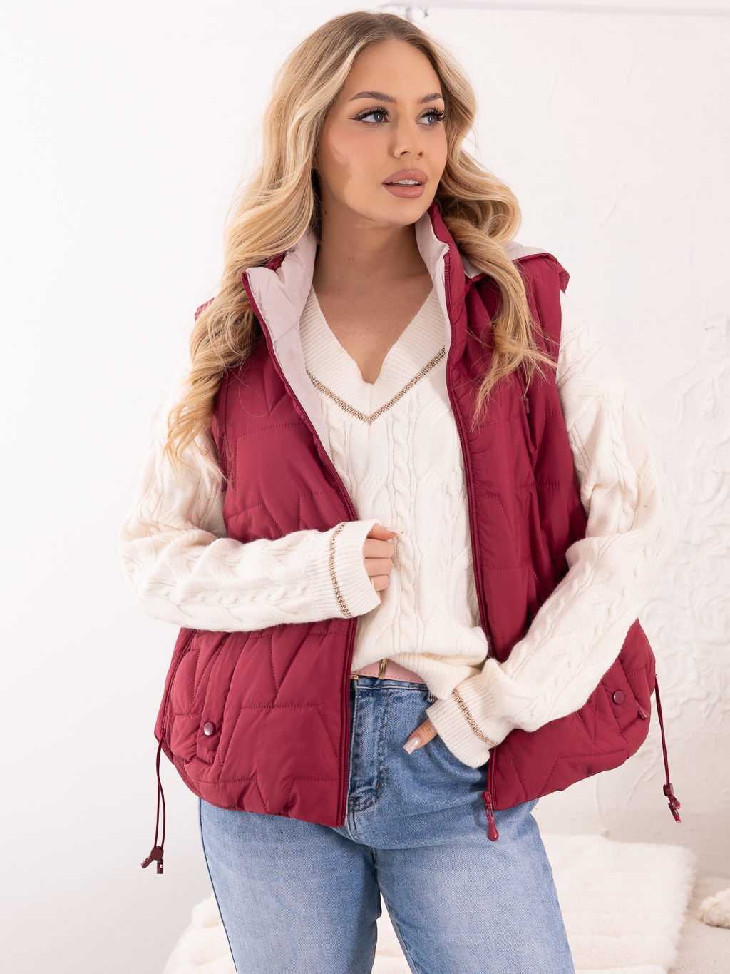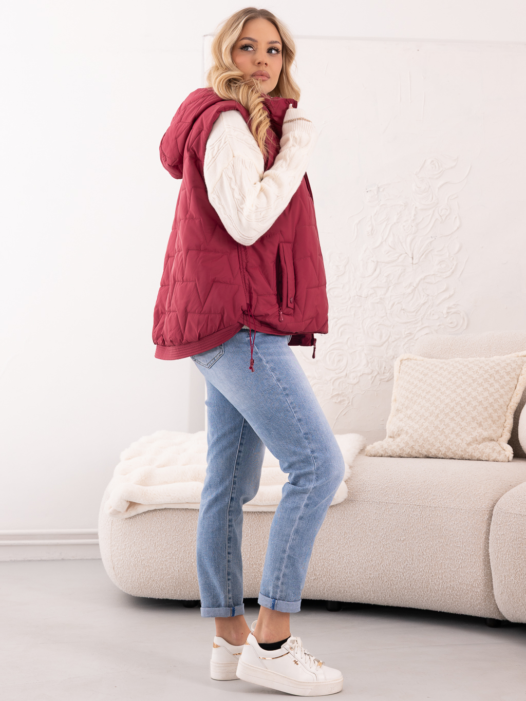 Lekka, a jednocześnie praktyczna kamizelka, świetnie sprawdzi się jako uzupełnienie codziennych stylizacji. Modne pikowanie w ząbki nadaje jej nowoczesnego charakteru, a kaptur zapewnia ochronę przed wiatrem i chłodem. Bezrękawnik posiada ściągacze wzdłuż boków, które podkreślają sylwetkę i zwiększają komfort noszenia. Praktyczne kieszenie pozwalają na wygodne przechowywanie drobiazgów. Kamizelka idealnie komponuje się zarówno z bluzą, swetrem, jak i lekką kurtką, tworząc stylowy i funkcjonalny look na sezon przejściowy.