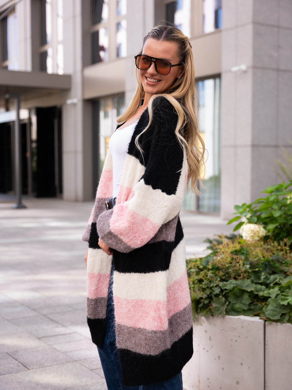 Miękki sweterek- kardigan z długim rękawem. Wzór w pasy łączący najmodniejsze kolory tworzy idealną kompozycję na zbliżającą się jesień. Dłuższy krój o luźnym charakterze gwarantuje wygodę i swobodę ruchów! W sam raz na co dzień lub na wyjątkową okazję. Bądź stylowa i urocza jednocześnie, stawiając na nowe trendy!