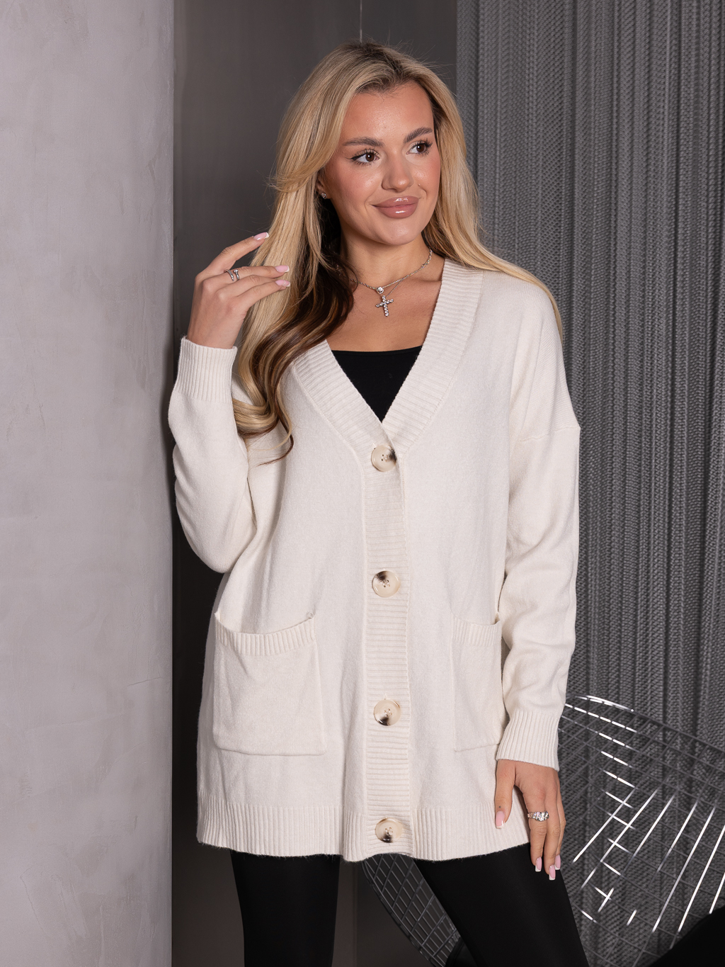 Stylowy i ponadczasowy kardigan to idealny wybór na chłodniejsze dni. Wykonany z miękkiej, przyjemnej w dotyku tkaniny, zapewnia komfort i ciepło przez cały dzień. Model zapinany jest na duże guziki z przodu, posiada głęboki dekolt w serek oraz praktyczne, naszyte kieszenie. Ribowane wykończenia przy mankietach, kieszeniach i dole swetra nadają mu eleganckiego charakteru, a luźny krój sprawia, że świetnie komponuje się zarówno z jeansami, jak i legginsami.