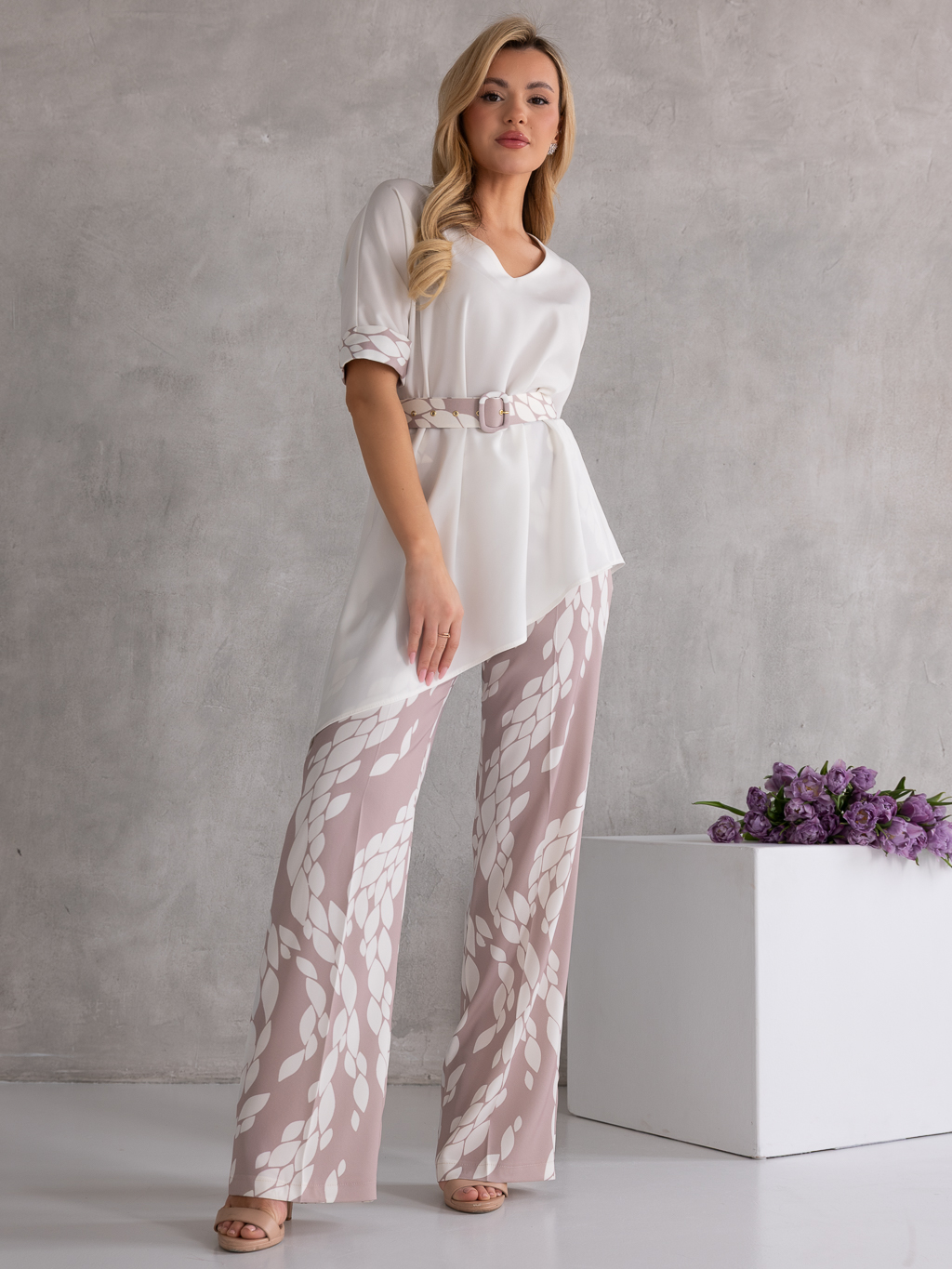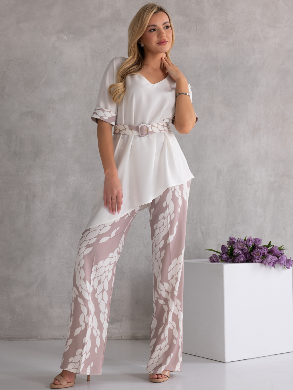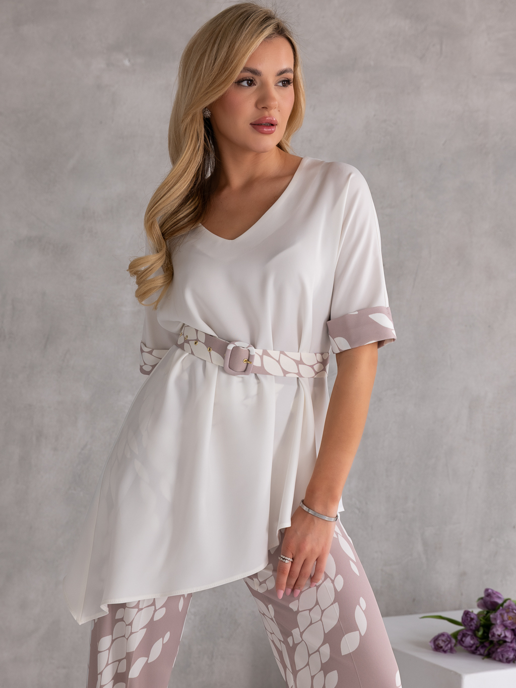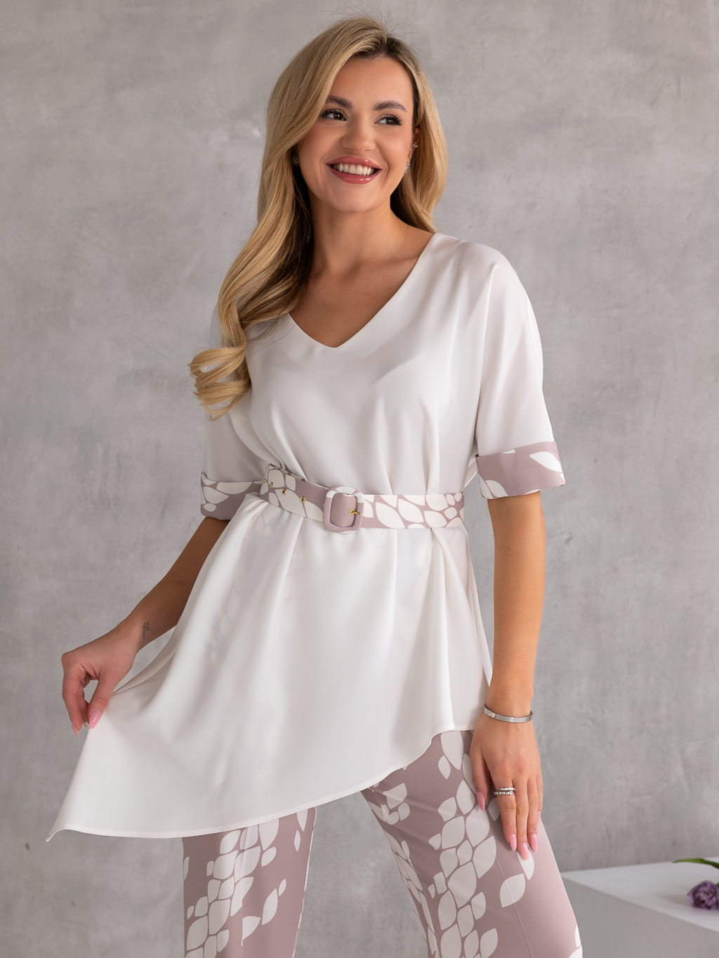Elegancki komplet, który łączy nowoczesny krój z subtelnymi, kobiecymi detalami. Asymetryczna bluzka z dekoltem w serek pięknie podkreśla sylwetkę i nadaje stylizacji wyjątkowego charakteru. Model posiada krótki rękawek ozdobiony dekoracyjną lamówką we wzór płatków, która pojawia się również na pasku, tworząc spójną i stylową całość. Pasek ze złotymi elementami dodatkowo podkreśla talię i dodaje eleganckiego akcentu.