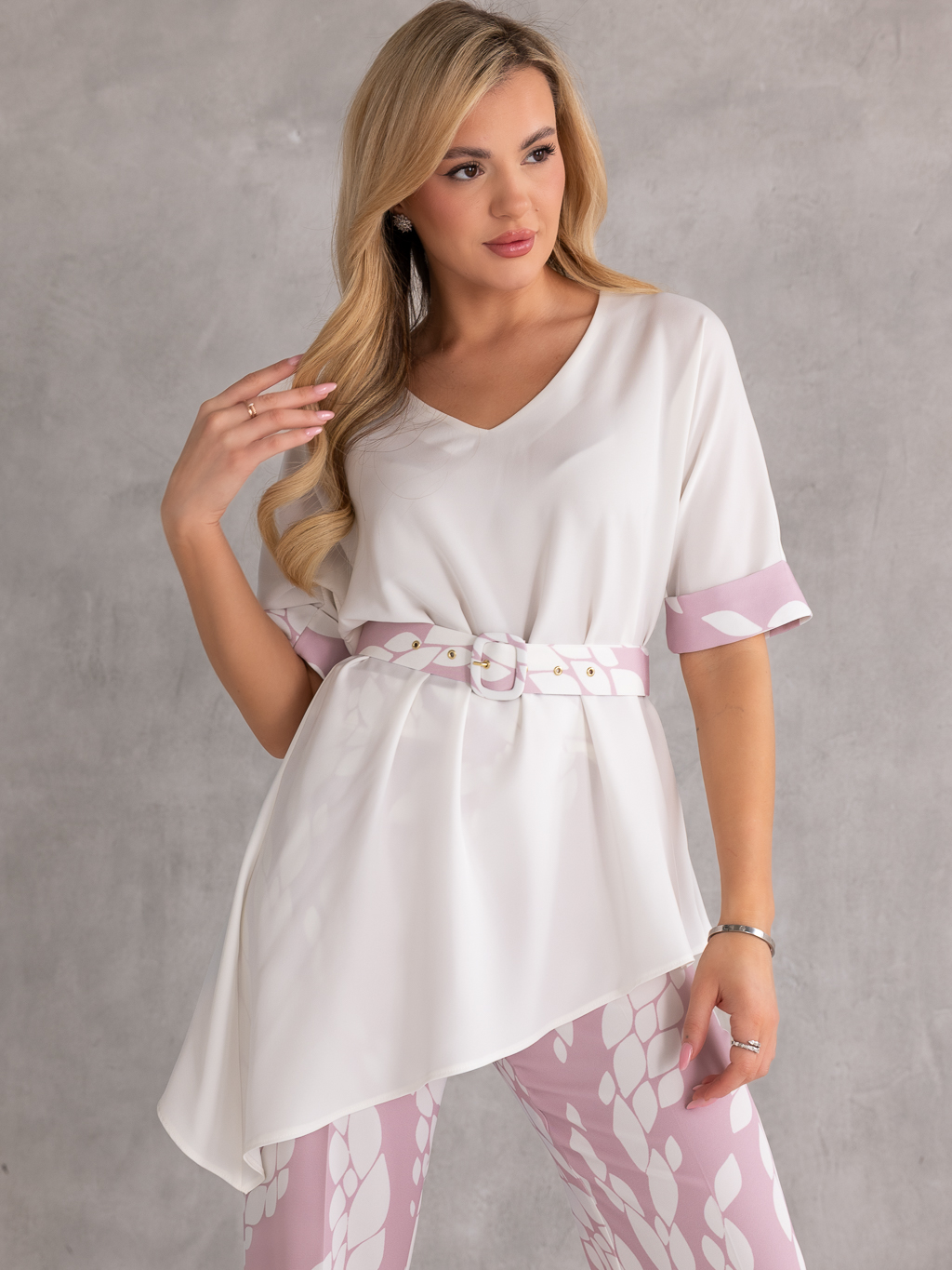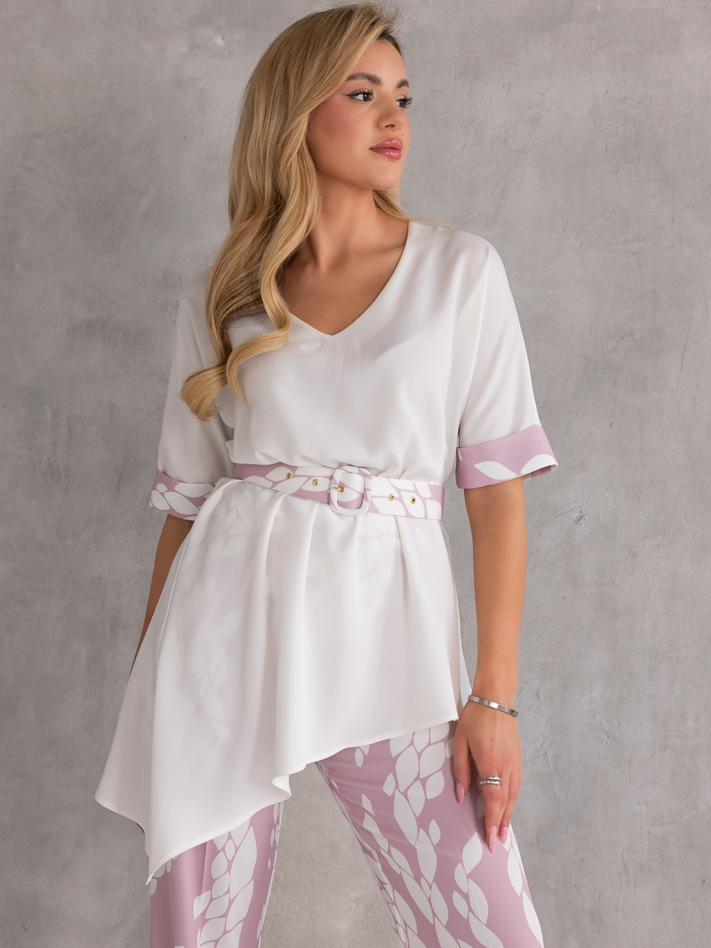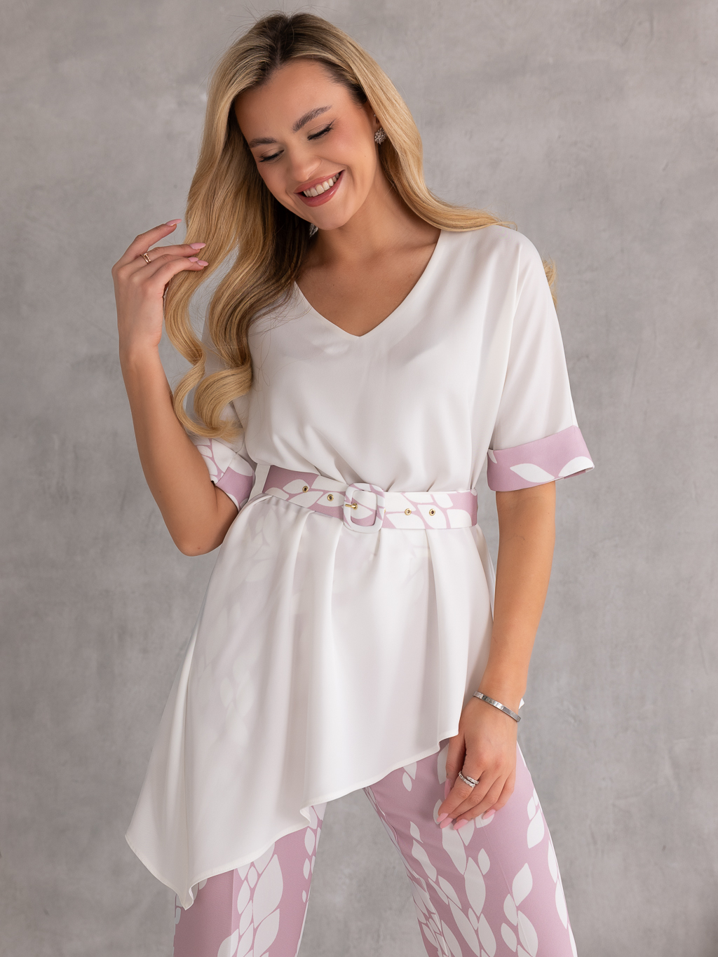 Elegancki komplet, który łączy nowoczesny krój z subtelnymi, kobiecymi detalami. Asymetryczna bluzka z dekoltem w serek pięknie podkreśla sylwetkę i nadaje stylizacji wyjątkowego charakteru. Model posiada krótki rękawek ozdobiony dekoracyjną lamówką we wzór płatków, która pojawia się również na pasku, tworząc spójną i stylową całość. Pasek ze złotymi elementami dodatkowo podkreśla talię i dodaje eleganckiego akcentu.