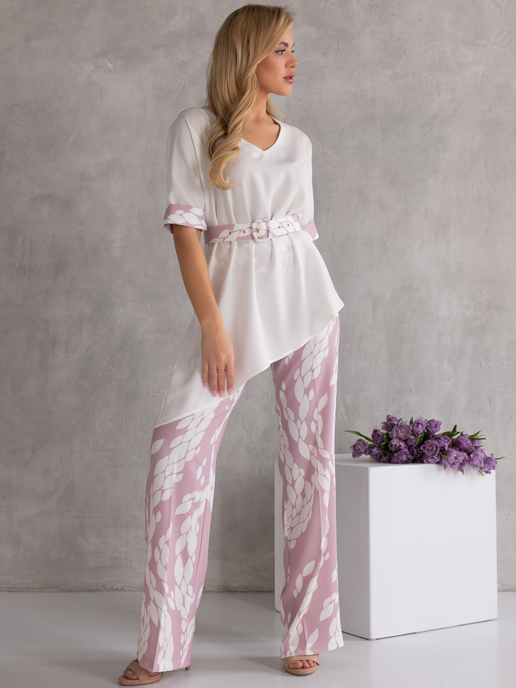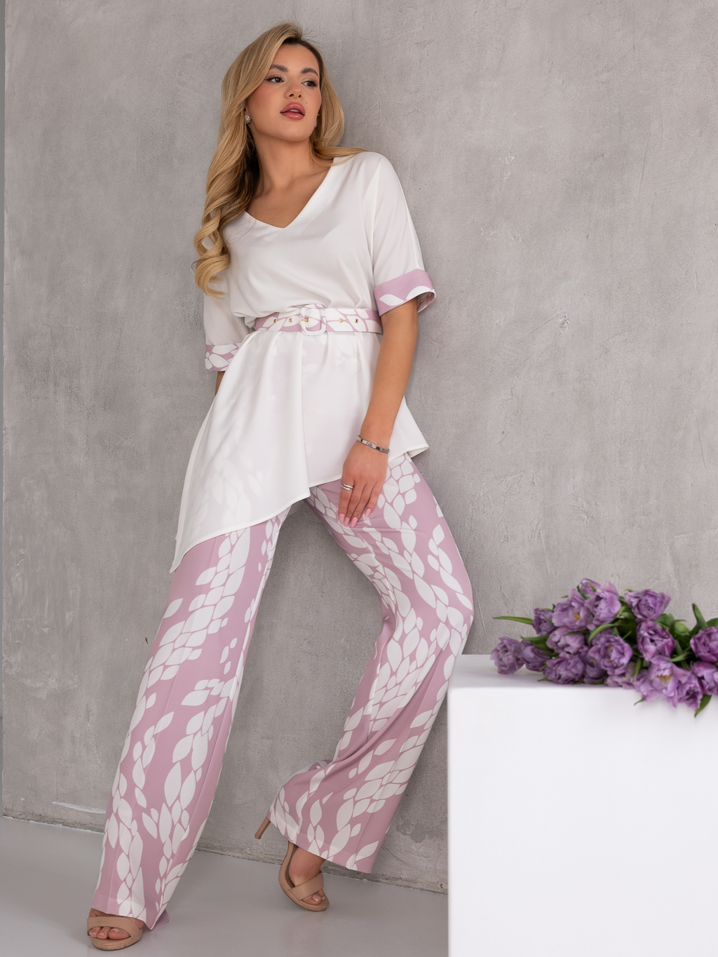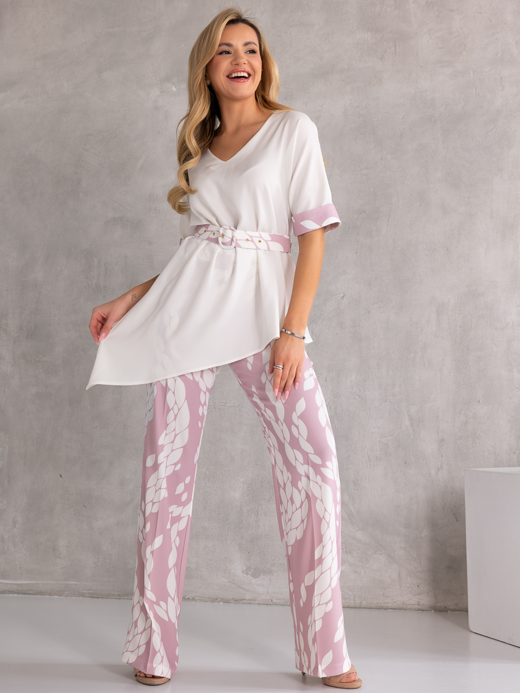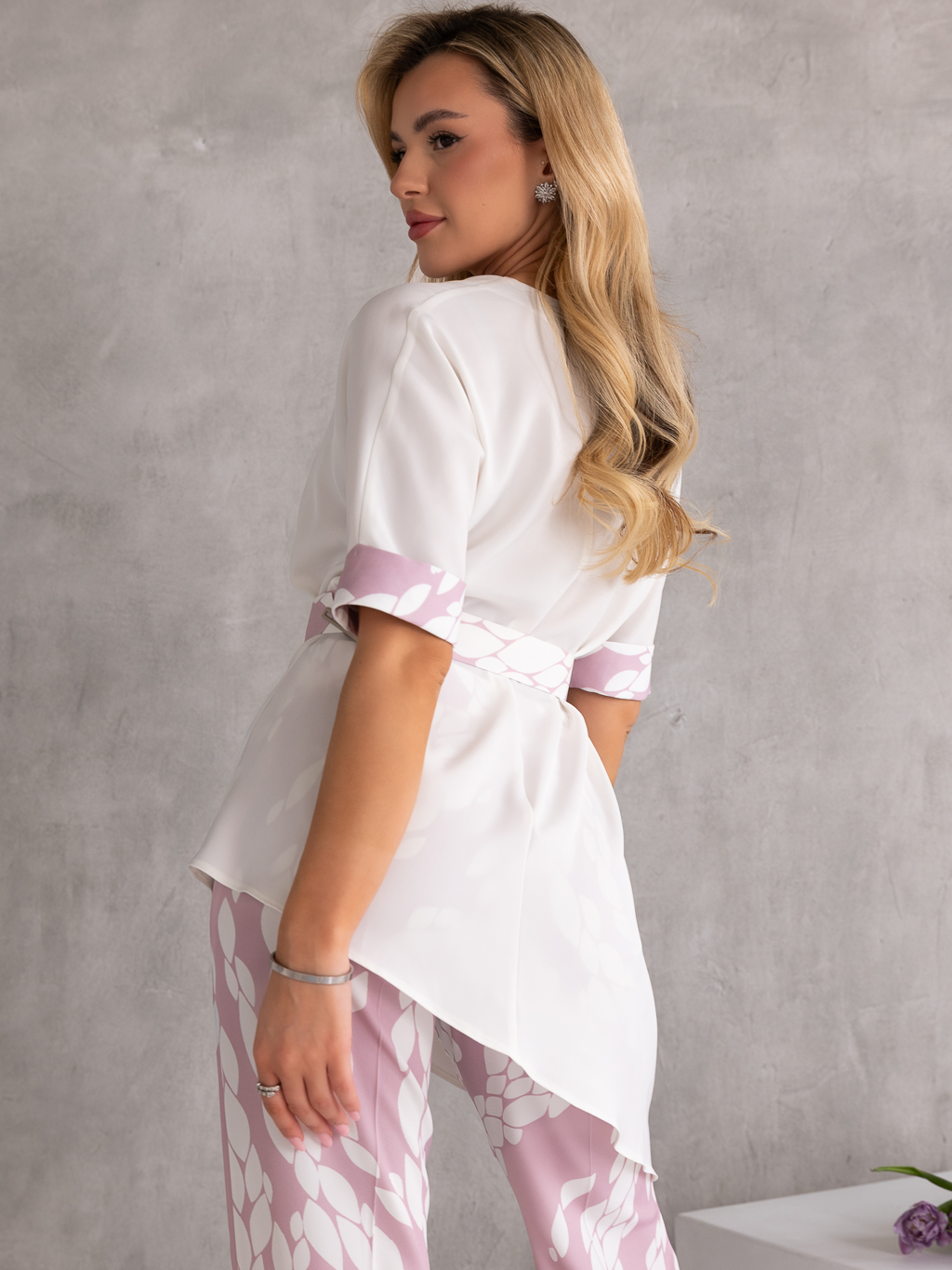 Elegancki komplet, który łączy nowoczesny krój z subtelnymi, kobiecymi detalami. Asymetryczna bluzka z dekoltem w serek pięknie podkreśla sylwetkę i nadaje stylizacji wyjątkowego charakteru. Model posiada krótki rękawek ozdobiony dekoracyjną lamówką we wzór płatków, która pojawia się również na pasku, tworząc spójną i stylową całość. Pasek ze złotymi elementami dodatkowo podkreśla talię i dodaje eleganckiego akcentu.