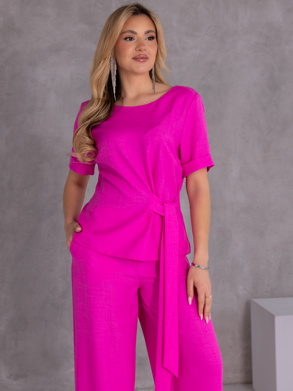 Elegancki komplet składający się z bluzki i długich spodni, który łączy styl, wygodę i nowoczesny fason. To idealna propozycja zarówno na co dzień, jak i na bardziej eleganckie wyjścia. Bluzka posiada krótkie, podwinięte rękawki, co nadaje jej lekko swobodnego charakteru. Wiązanie na boku pięknie podkreśla talię i pozwala dopasować fason do sylwetki, dodając całości kobiecego wykończenia.