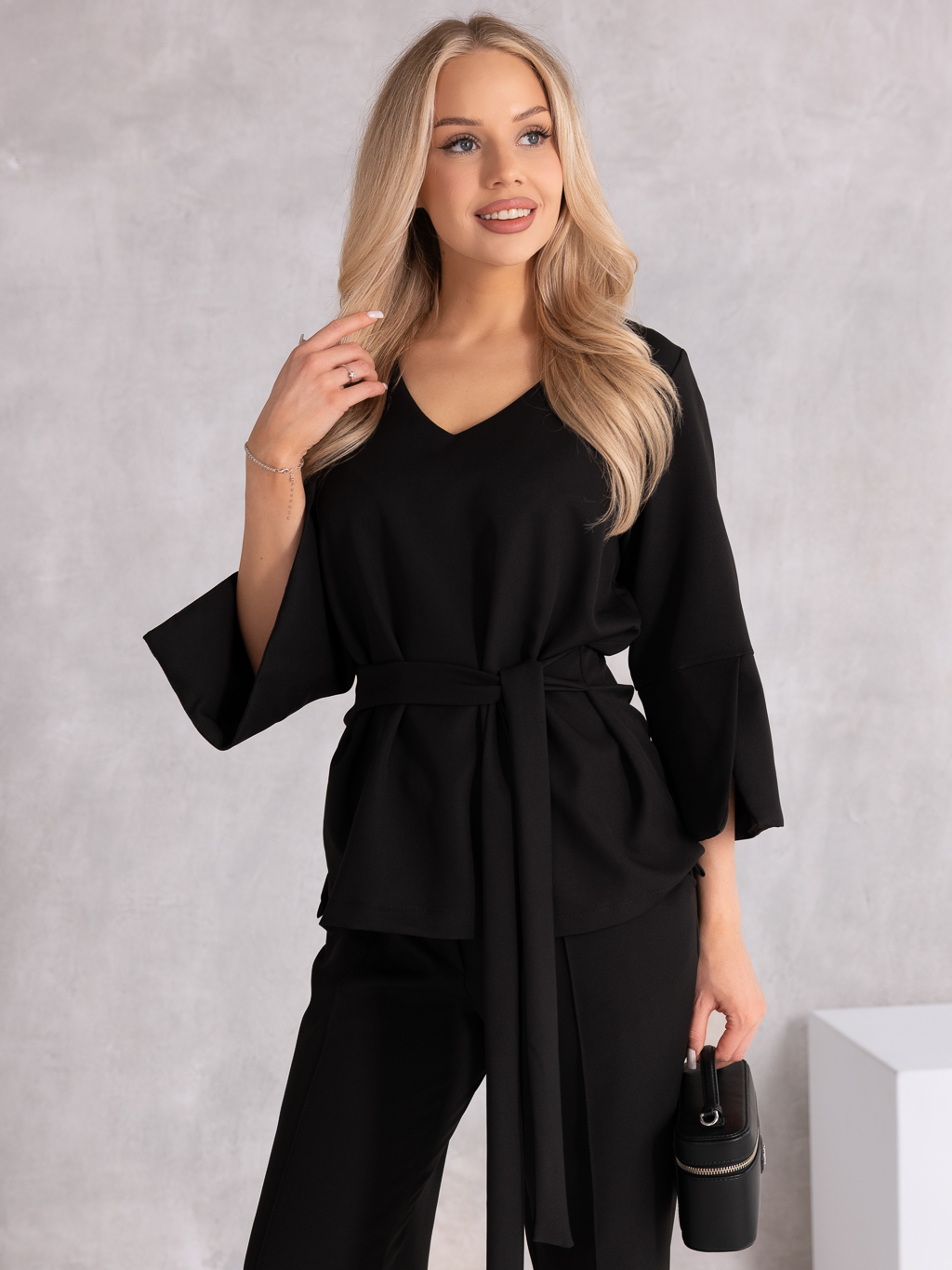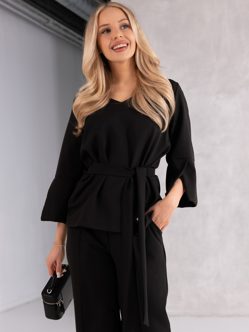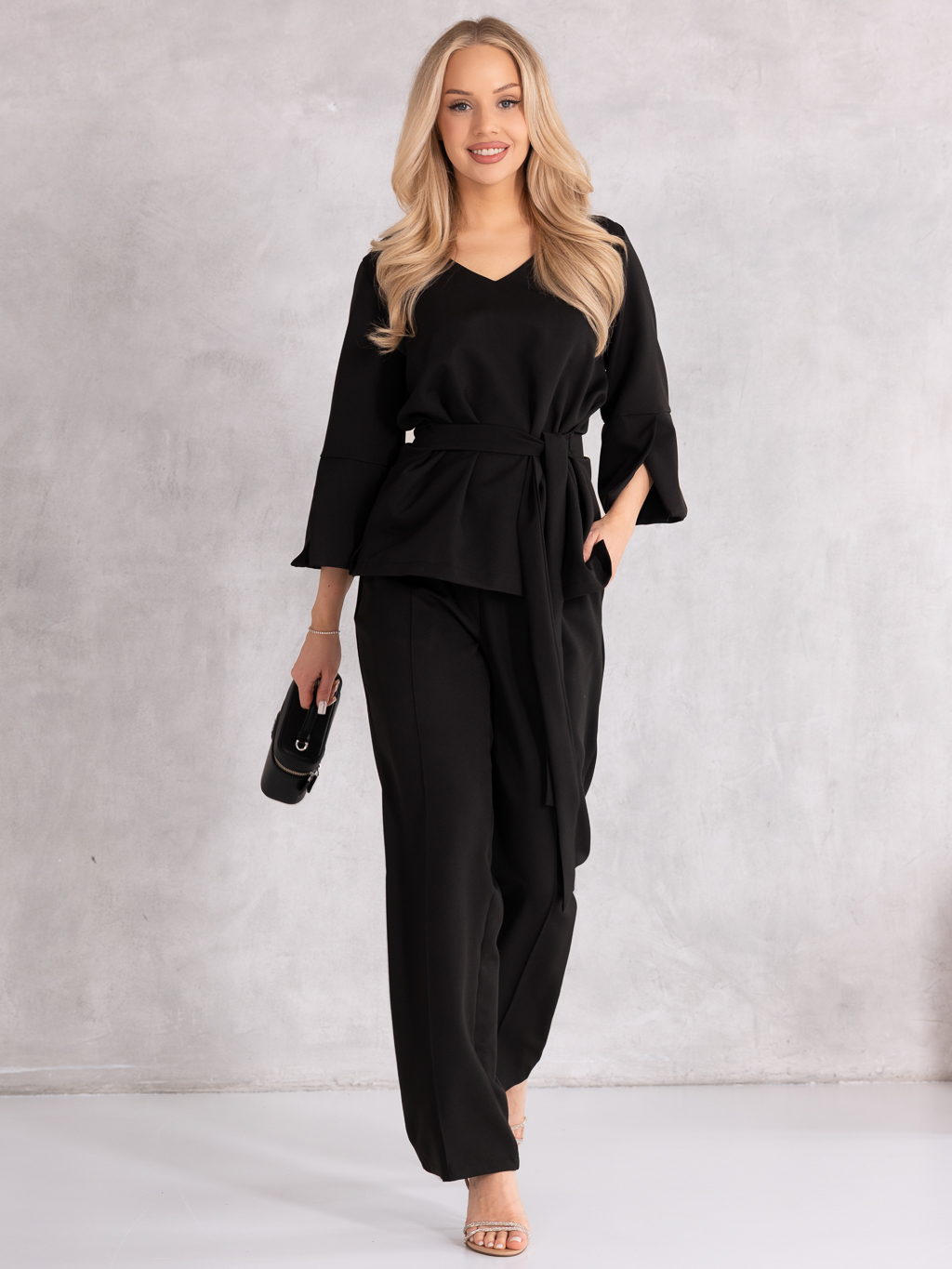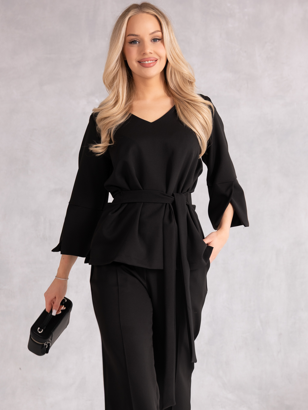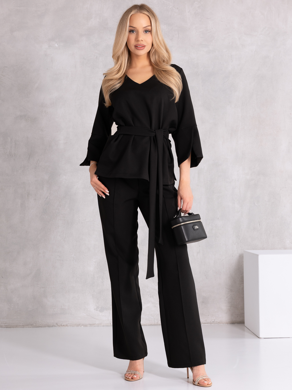 Elegancki komplet, który łączy klasykę z nowoczesnym fasonem i wygodą noszenia. Bluzka z rękawem 3/4 i subtelnymi rozcięciami na dole rękawów prezentuje się lekko i stylowo. Dekolt w serek pięknie podkreśla szyję, a wiązanie w pasie pozwala na idealne dopasowanie i zaakcentowanie talii. Spodnie o szerokich nogawkach z dekoracyjnymi przeszyciami dodają całości eleganckiego charakteru i optycznie wydłużają sylwetkę. Model posiada gumkę w pasie, co zapewnia komfort noszenia przez cały dzień, a praktyczne kieszenie zwiększają funkcjonalność.