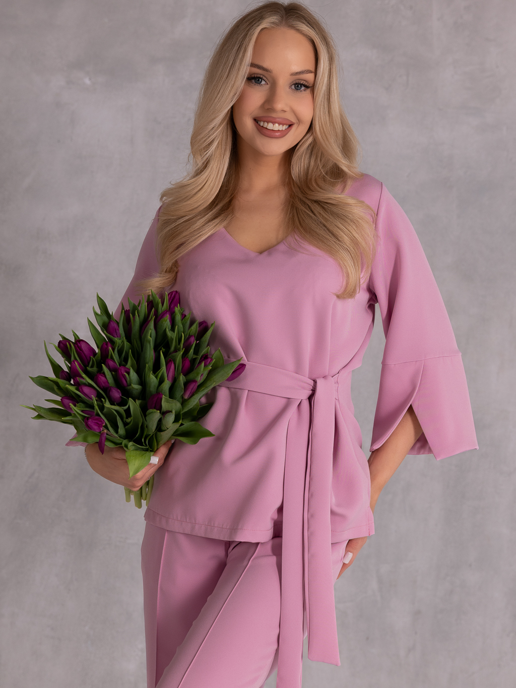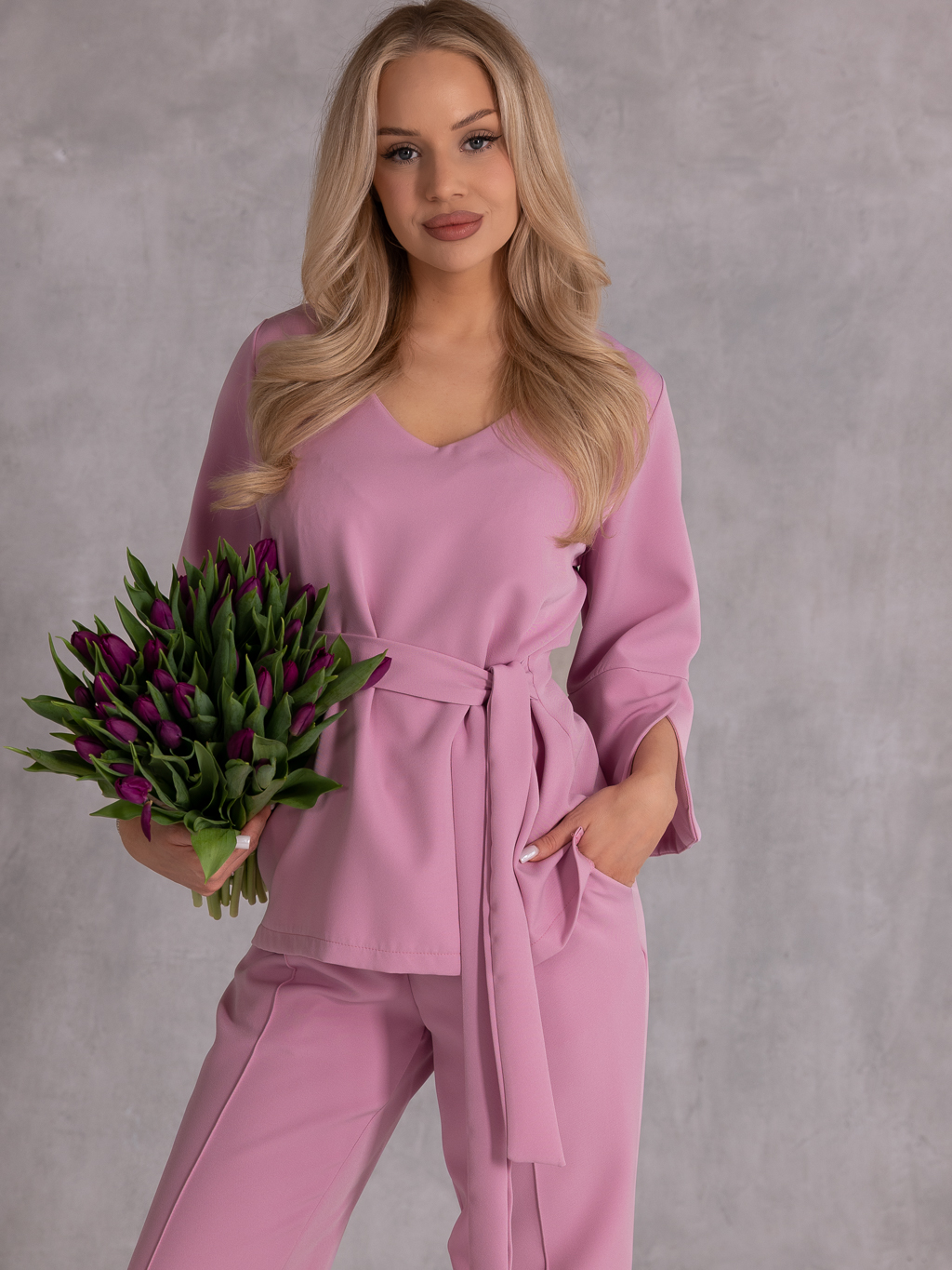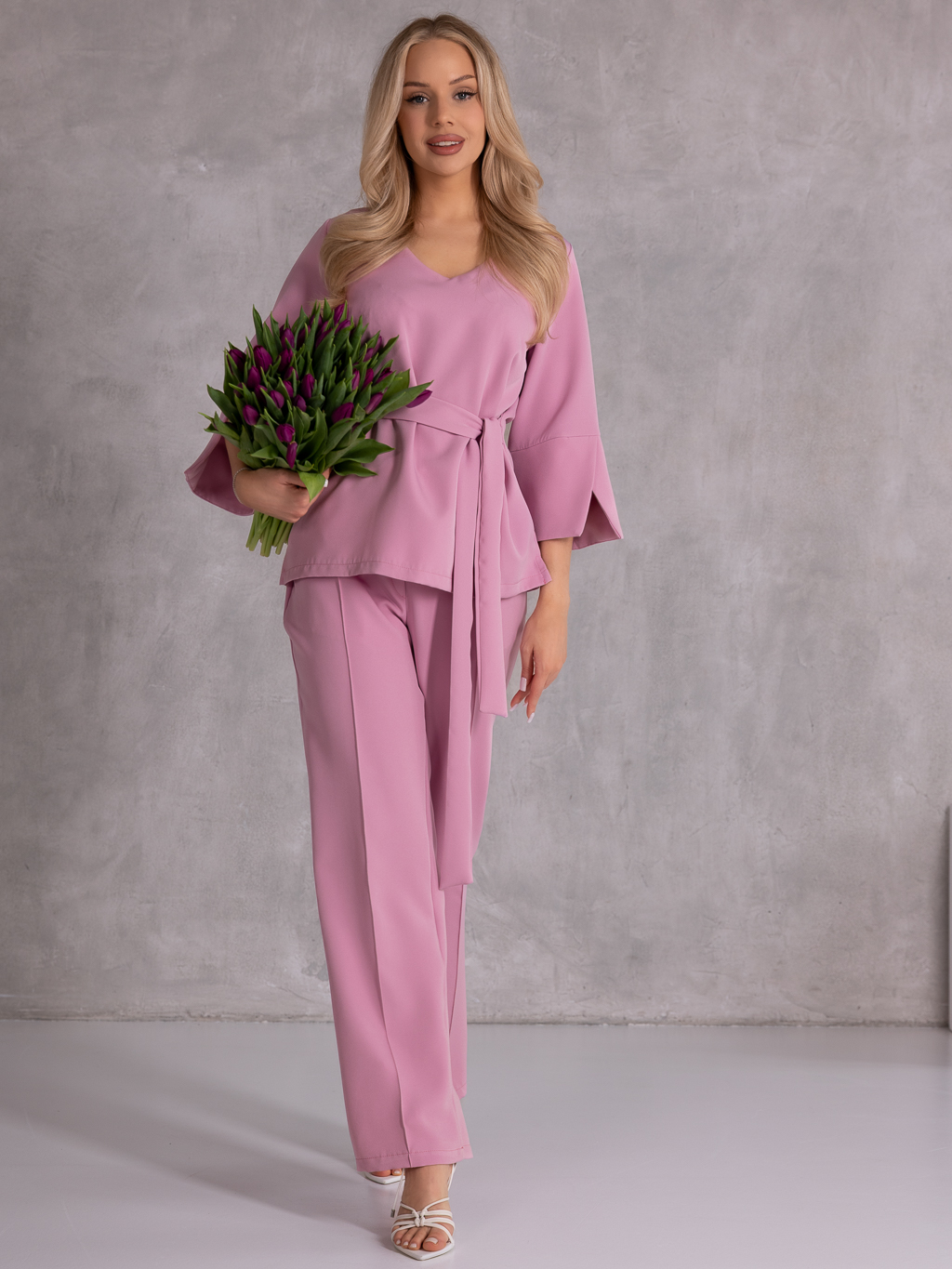 Elegancki komplet, który łączy klasykę z nowoczesnym fasonem i wygodą noszenia. Bluzka z rękawem 3/4 i subtelnymi rozcięciami na dole rękawów prezentuje się lekko i stylowo. Dekolt w serek pięknie podkreśla szyję, a wiązanie w pasie pozwala na idealne dopasowanie i zaakcentowanie talii. Spodnie o szerokich nogawkach z dekoracyjnymi przeszyciami dodają całości eleganckiego charakteru i optycznie wydłużają sylwetkę. Model posiada gumkę w pasie, co zapewnia komfort noszenia przez cały dzień, a praktyczne kieszenie zwiększają funkcjonalność.