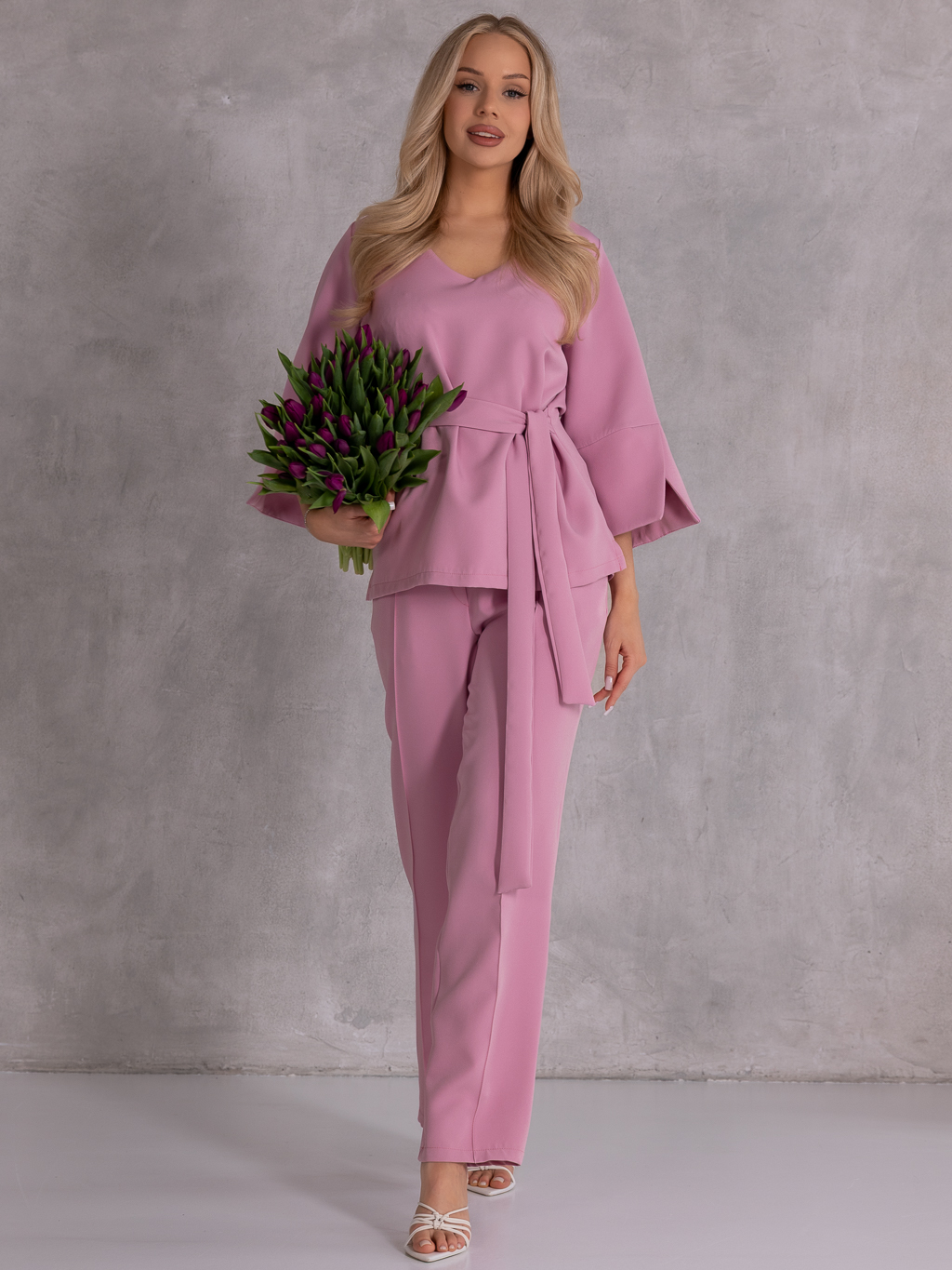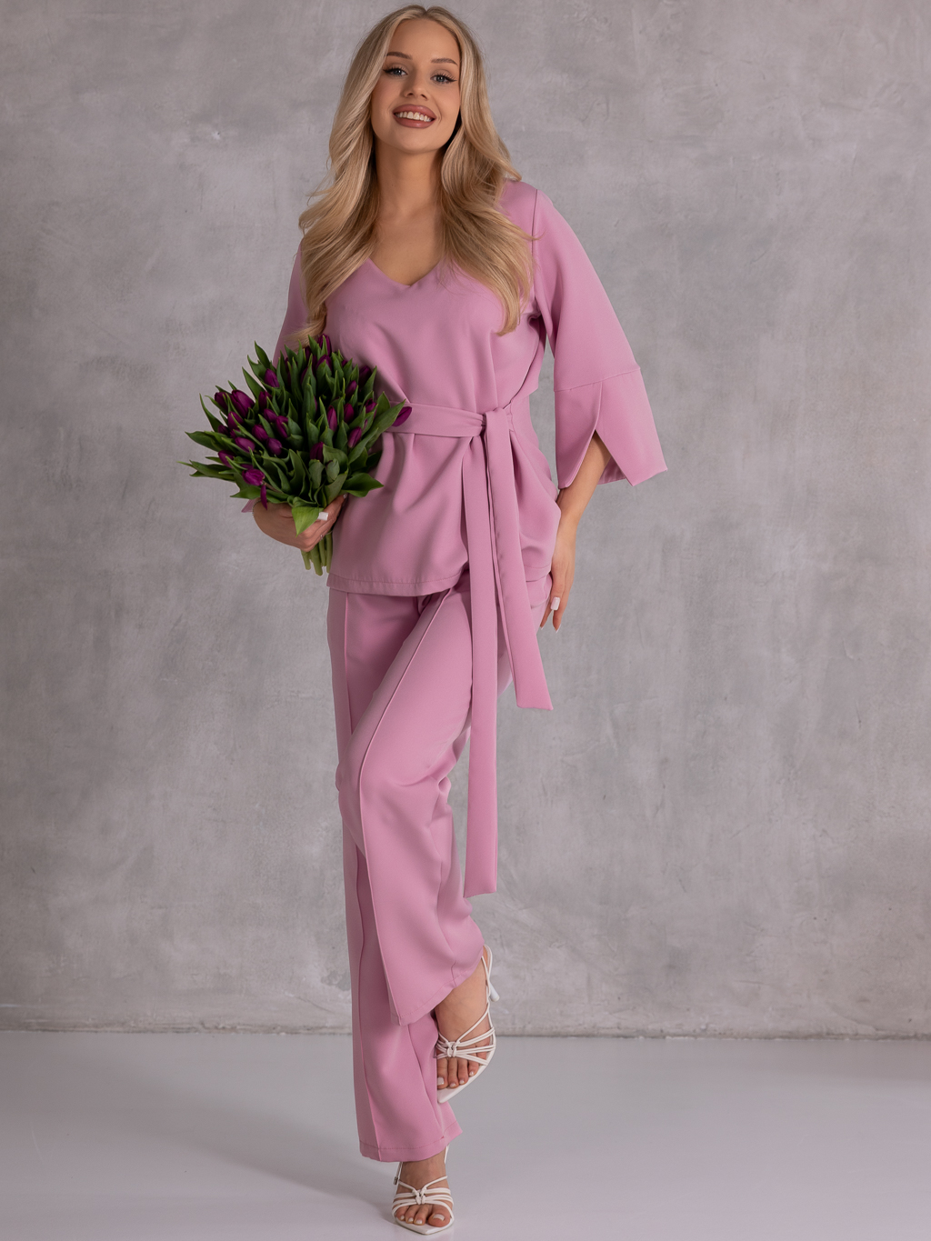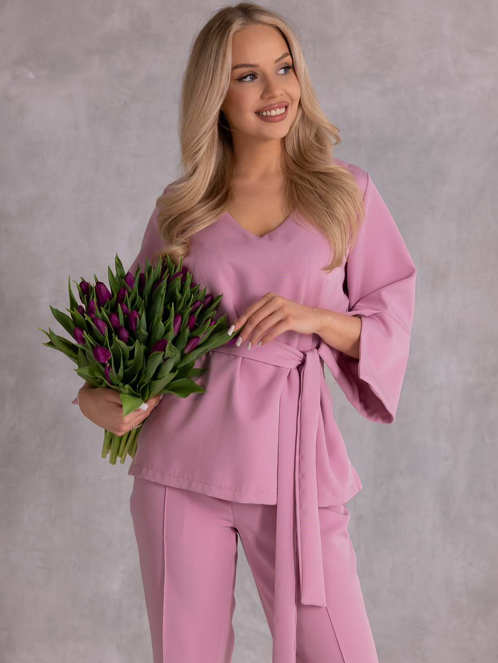 Elegancki komplet, który łączy klasykę z nowoczesnym fasonem i wygodą noszenia. Bluzka z rękawem 3/4 i subtelnymi rozcięciami na dole rękawów prezentuje się lekko i stylowo. Dekolt w serek pięknie podkreśla szyję, a wiązanie w pasie pozwala na idealne dopasowanie i zaakcentowanie talii. Spodnie o szerokich nogawkach z dekoracyjnymi przeszyciami dodają całości eleganckiego charakteru i optycznie wydłużają sylwetkę. Model posiada gumkę w pasie, co zapewnia komfort noszenia przez cały dzień, a praktyczne kieszenie zwiększają funkcjonalność.