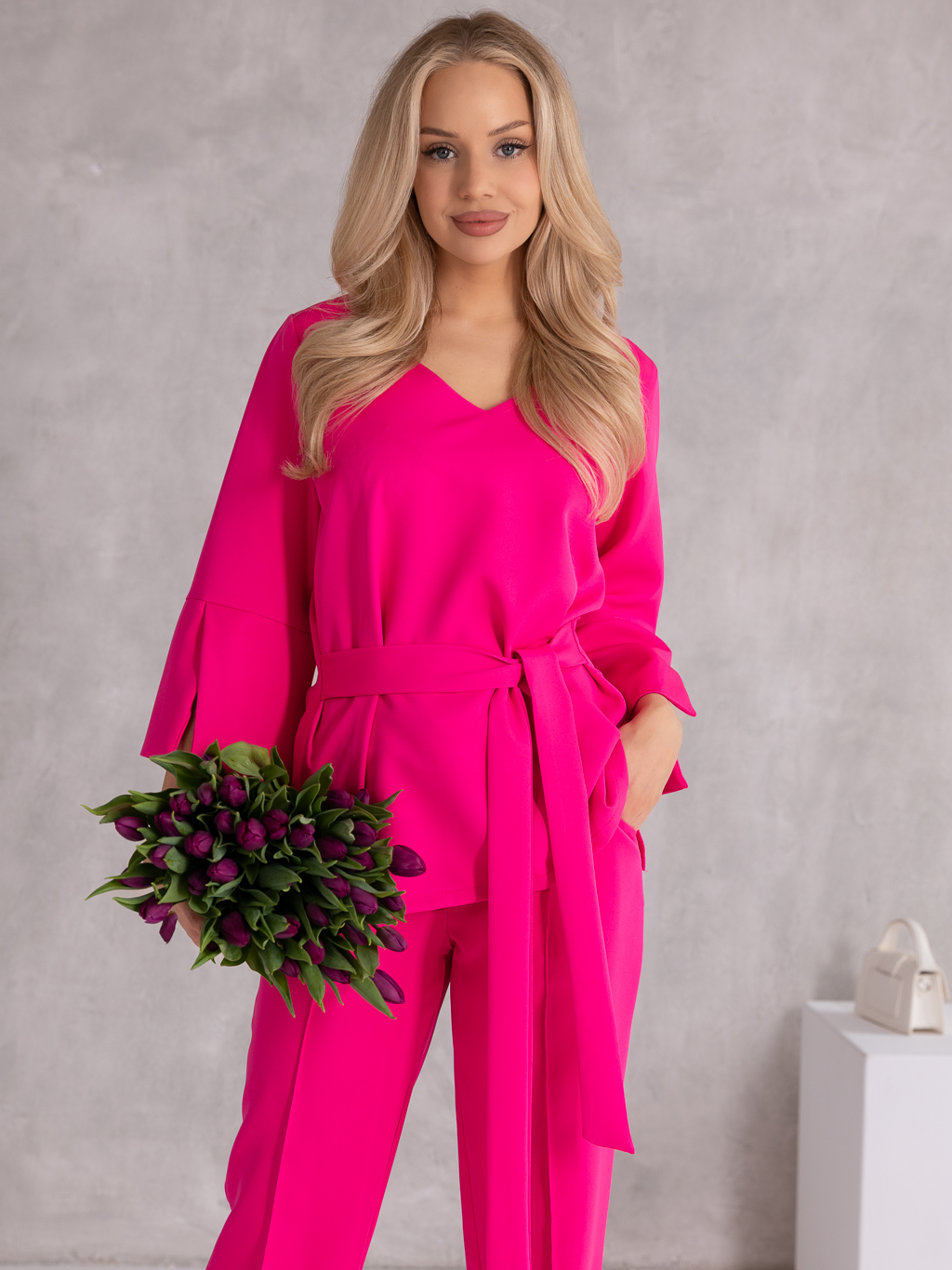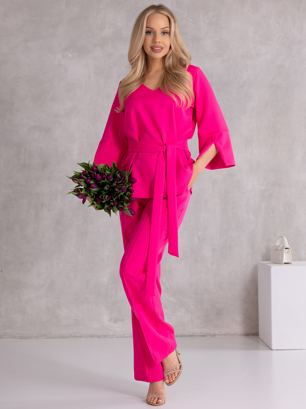 Elegancki komplet, który łączy klasykę z nowoczesnym fasonem i wygodą noszenia. Bluzka z rękawem 3/4 i subtelnymi rozcięciami na dole rękawów prezentuje się lekko i stylowo. Dekolt w serek pięknie podkreśla szyję, a wiązanie w pasie pozwala na idealne dopasowanie i zaakcentowanie talii. Spodnie o szerokich nogawkach z dekoracyjnymi przeszyciami dodają całości eleganckiego charakteru i optycznie wydłużają sylwetkę. Model posiada gumkę w pasie, co zapewnia komfort noszenia przez cały dzień, a praktyczne kieszenie zwiększają funkcjonalność.