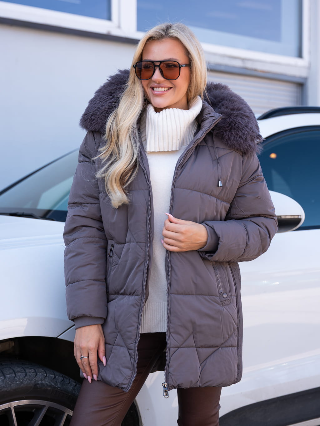Zimowa kurtka z futrzanym kapturem. Pikowany materiał nadający elegancji w połączaniu z elastycznym marszczeniem po bokach to idealny wybór na chłodne dni, w które potrzebna jest dodatkowa dawka mody! Komfortowy fason zapewnia swobodę ruchów, a kołnierz wykończony miękkim futerkiem ochroni Cię przed mrozem. Sprawdzi się na co dzień, a także na wyjątkowe wyjścia!
