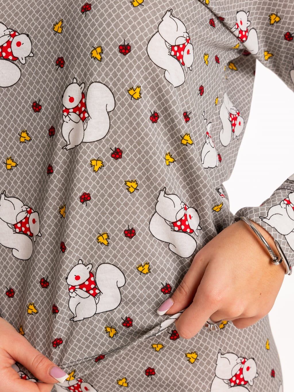 Dwuczęściowa piżama damska z bawełnianego materiału. Piżama składa się z bluzki z długim rękawem oraz długich spodni ze zwężaną nogawką. Formą ozdobną piżamy jest motyw w wiewiórki i listki.