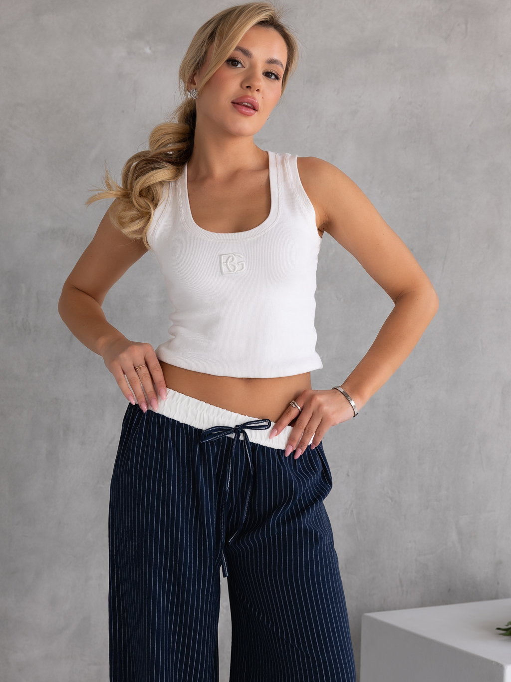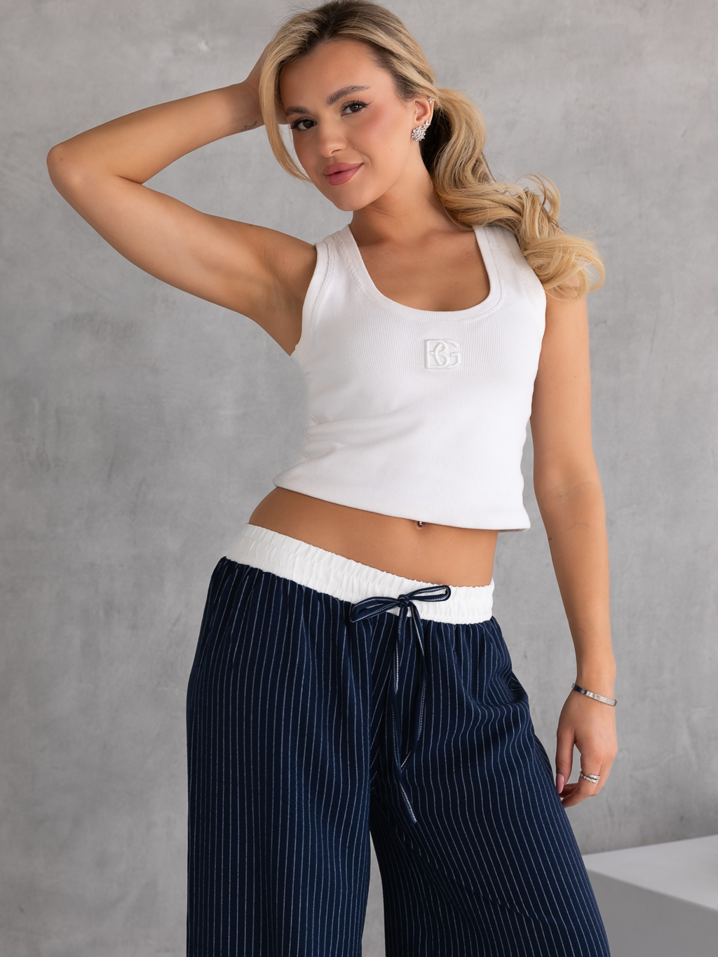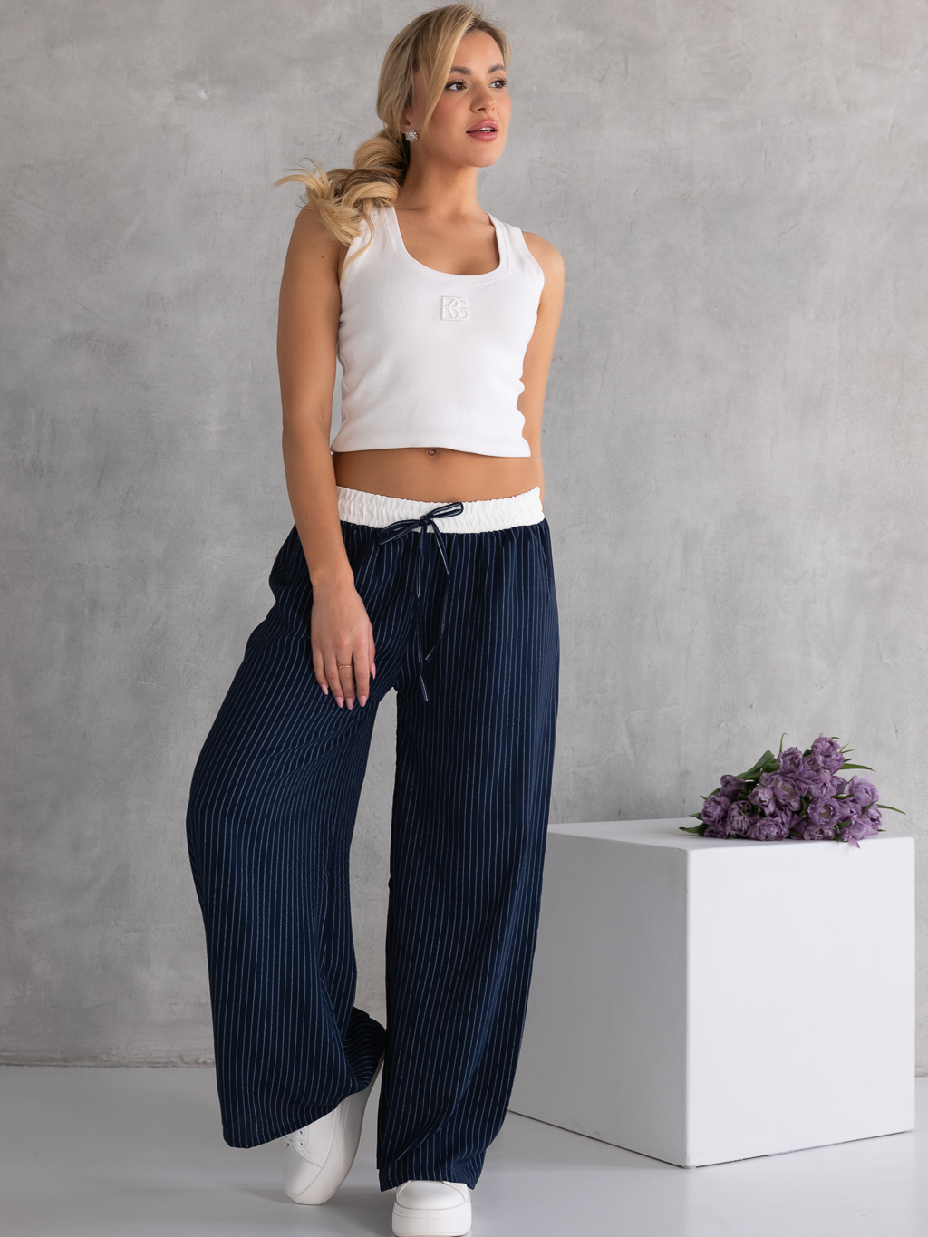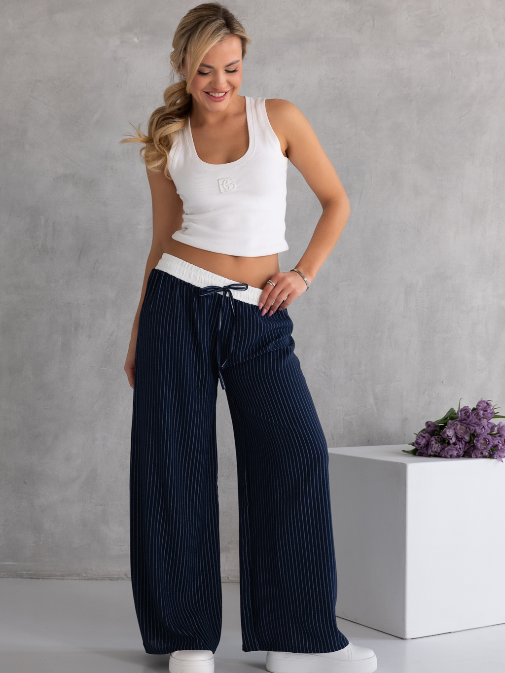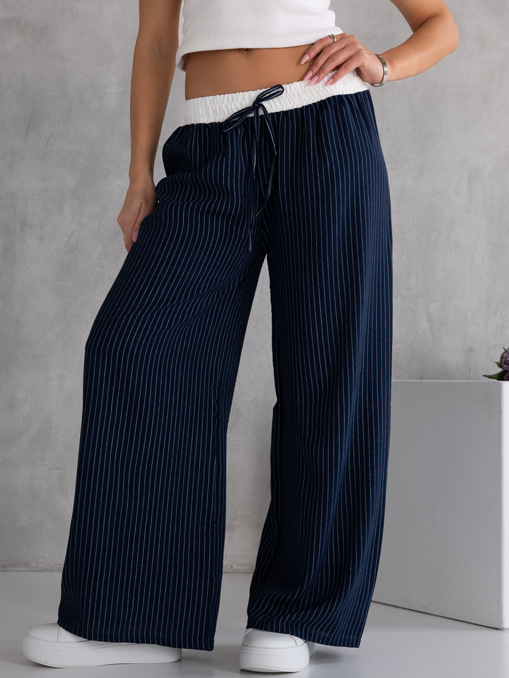 Stylowe spodnie o szerokim, swobodnym kroju, które łączą wygodę z modnym wyglądem. Pionowe paski optycznie wydłużają sylwetkę. Model posiada wygodną, białą gumkę w pasie, która zapewnia dobre dopasowanie i komfort noszenia. Ozdobny sznurek stanowi stylowy detal – ma charakter dekoracyjny i nie służy do regulacji pasa. Spodnie wykonane są z lekkiego, zwiewnego materiału, dzięki czemu świetnie sprawdzą się w casualowych stylizacjach.
