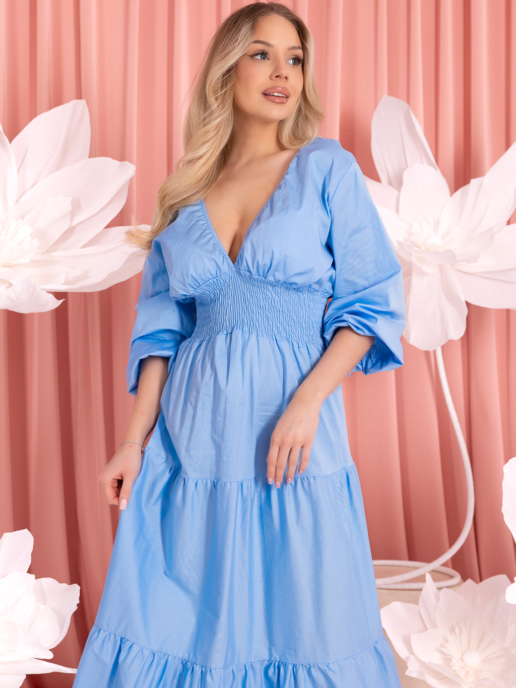 Sukienka maxi o kobiecym i lekkim fasonie, która doskonale sprawdzi się zarówno na wyjątkowe okazje, jak i w stylowych codziennych stylizacjach. Model posiada dekolt w serek, który subtelnie podkreśla szyję i optycznie wysmukla sylwetkę. Całość zdobią falbany rozmieszczone na całej długości sukienki, nadające jej lekkości i efektownego charakteru.
