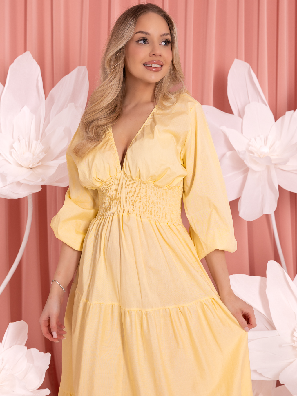 W talii znajduje się elastyczna gumka, która pięknie podkreśla talię i zapewnia komfort noszenia. Rękawy o długości 3/4 zakończone są gumką, dzięki czemu delikatnie się marszczą i elegancko układają. Sukienka wykonana jest z nierozciągliwego, eleganckiego materiału, który dobrze trzyma formę i prezentuje się bardzo stylowo. To doskonały wybór dla kobiet ceniących klasykę, wygodę i ponadczasowy wygląd.