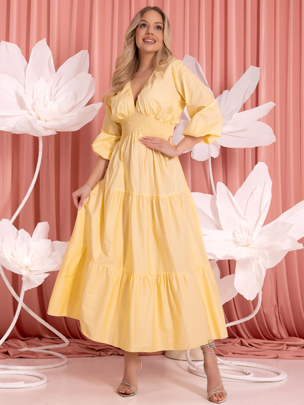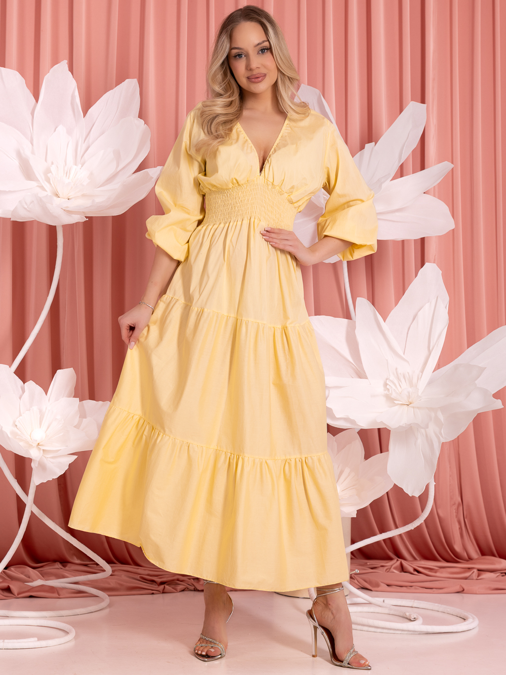 Sukienka maxi o kobiecym i lekkim fasonie, która doskonale sprawdzi się zarówno na wyjątkowe okazje, jak i w stylowych codziennych stylizacjach. Model posiada dekolt w serek, który subtelnie podkreśla szyję i optycznie wysmukla sylwetkę. Całość zdobią falbany rozmieszczone na całej długości sukienki, nadające jej lekkości i efektownego charakteru.