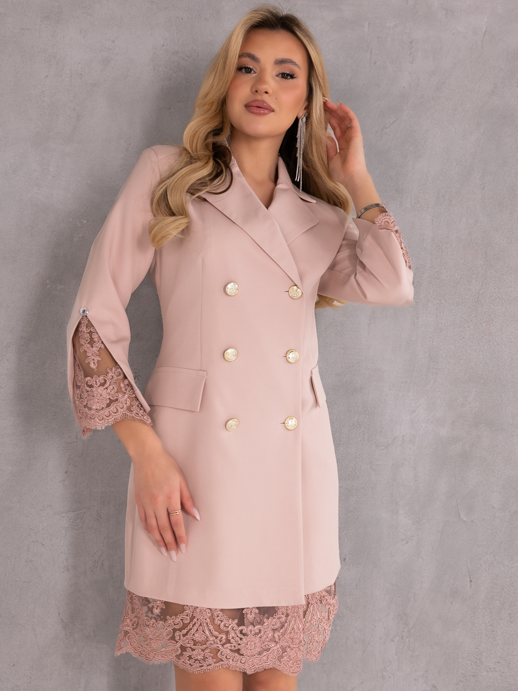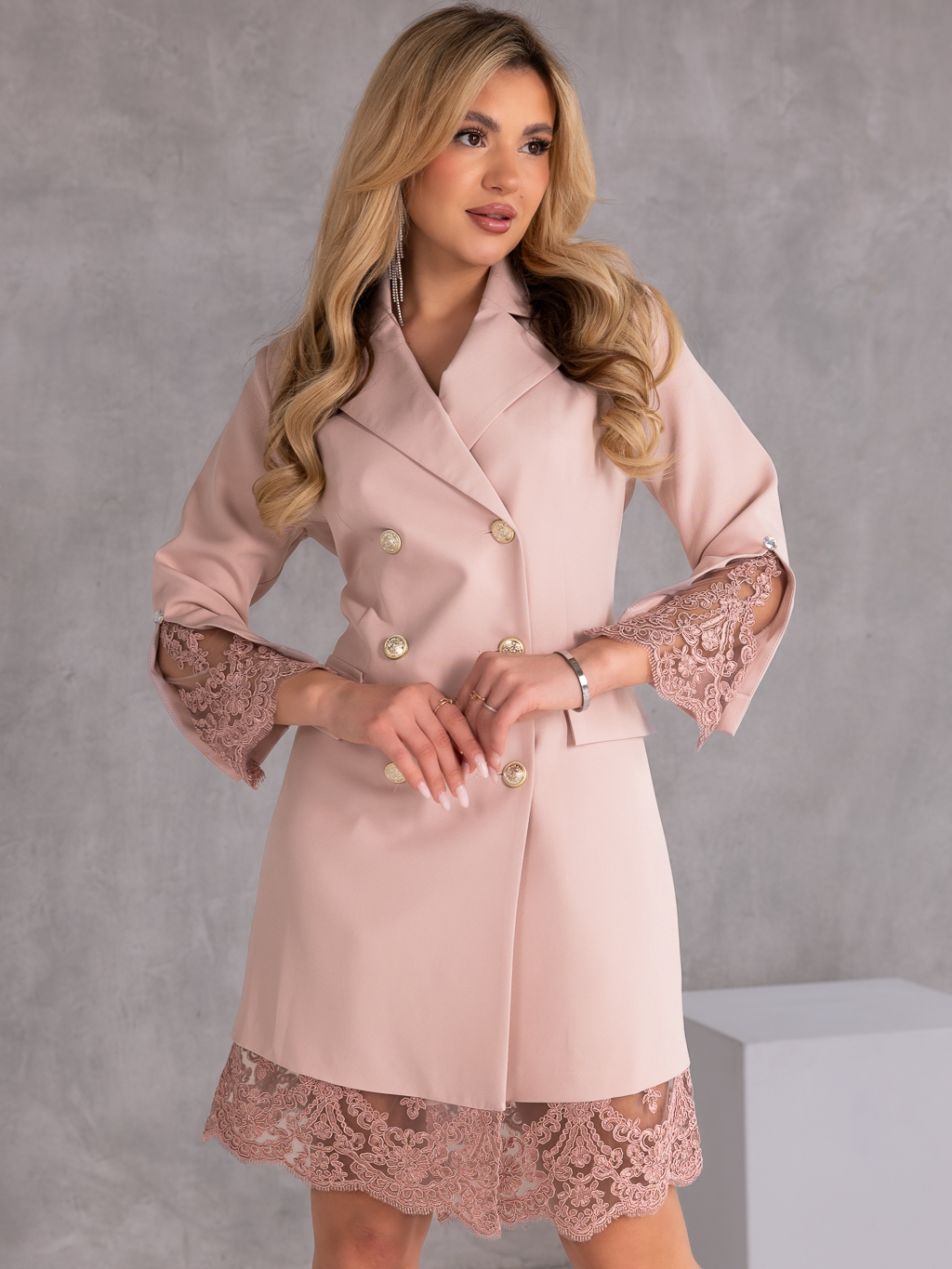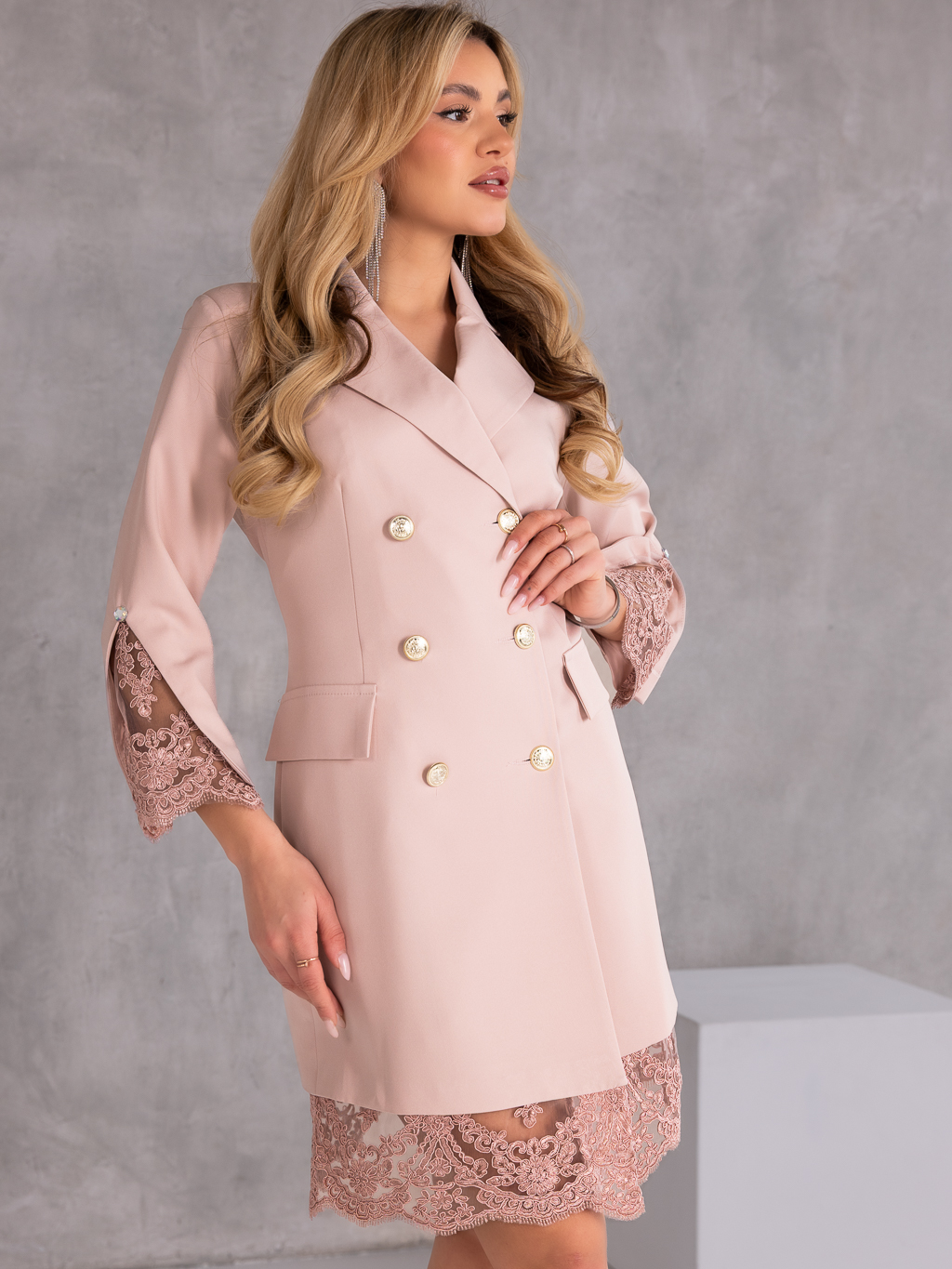Elegancka sukienka w stylu marynarki, która łączy klasyczną formę z kobiecymi detalami. Model o długości midi wyróżnia się ponadczasowym krojem inspirowanym żakietem, dzięki czemu doskonale sprawdzi się zarówno na formalne okazje, jak i stylowe wyjścia.