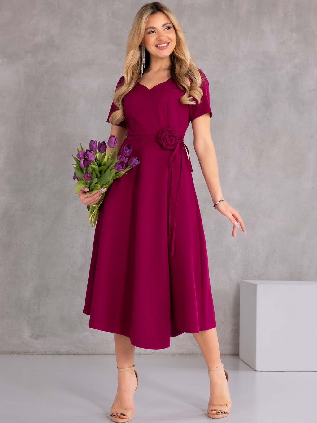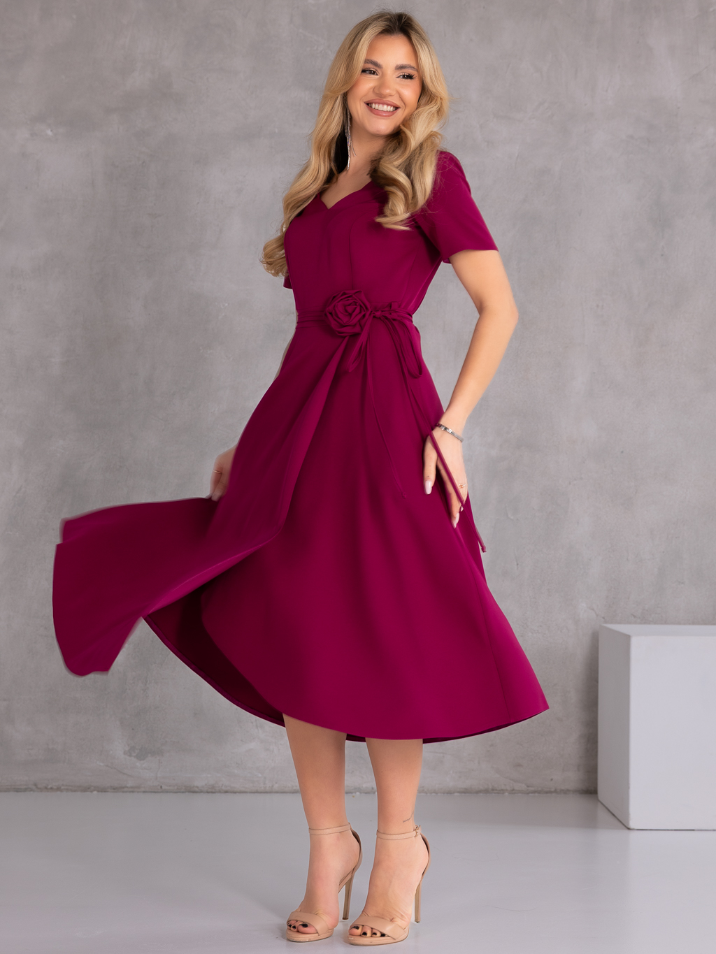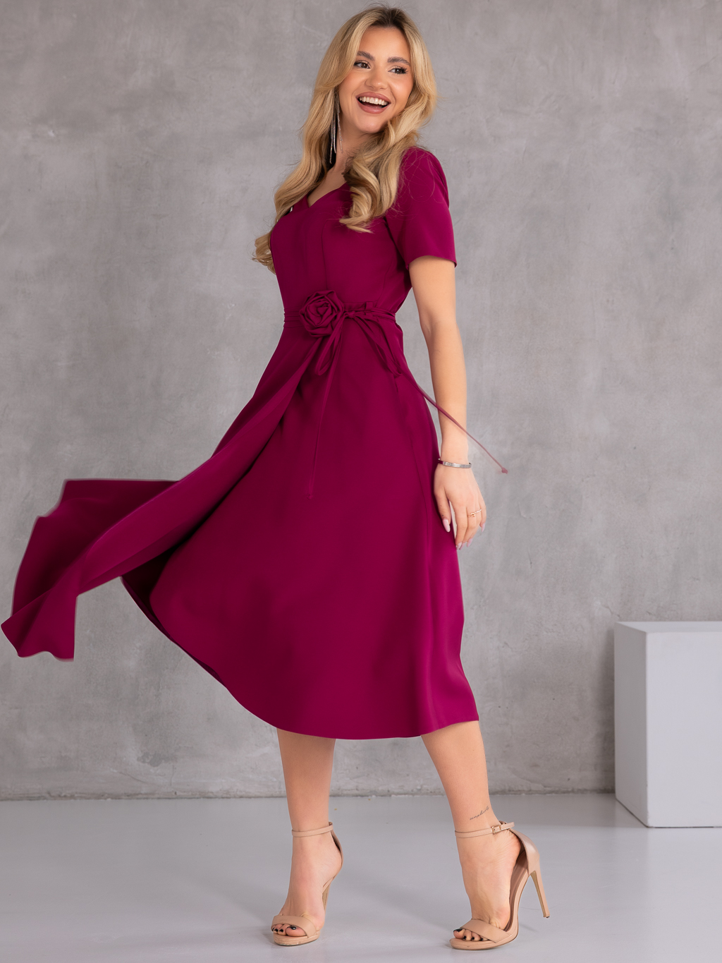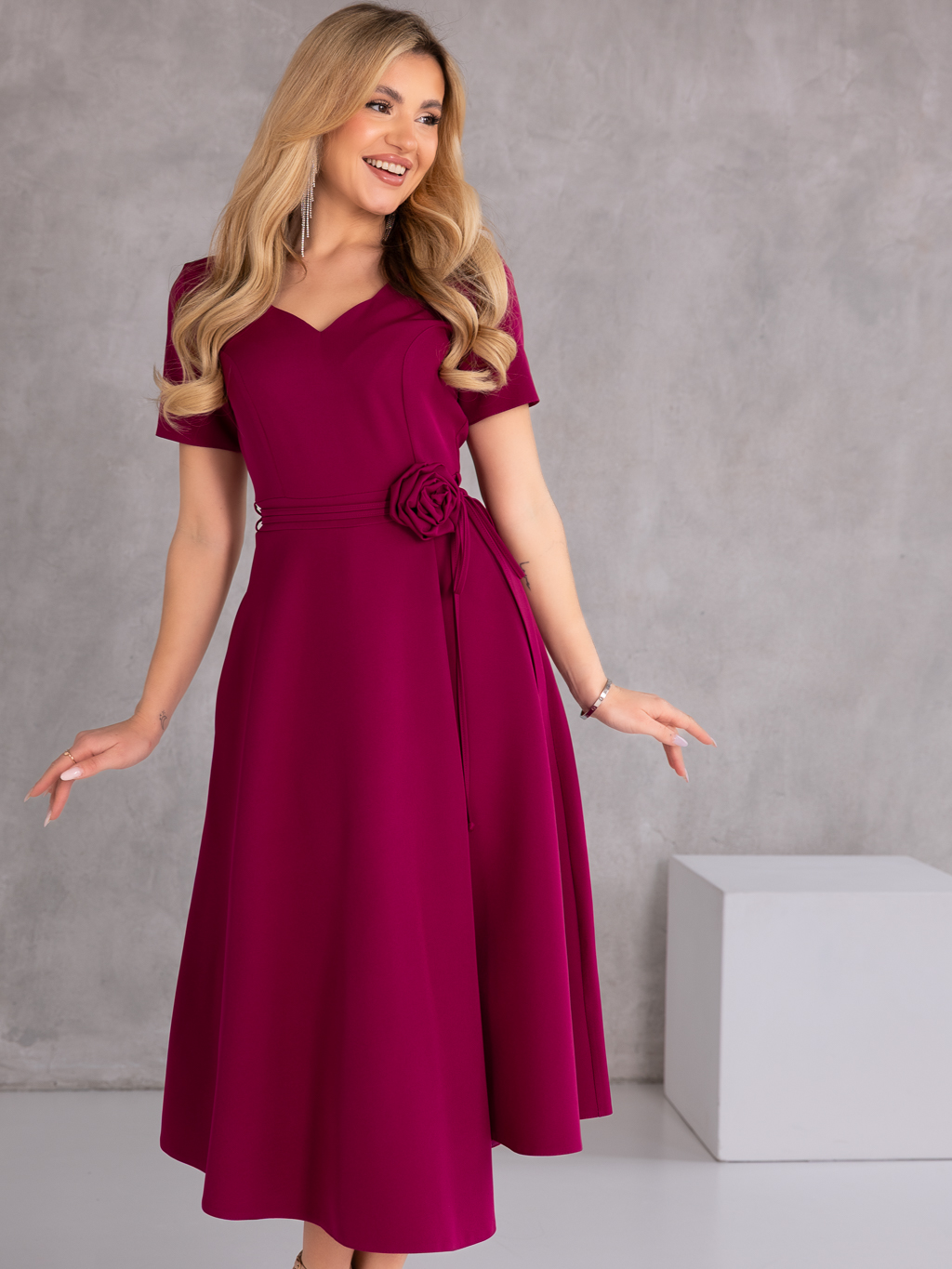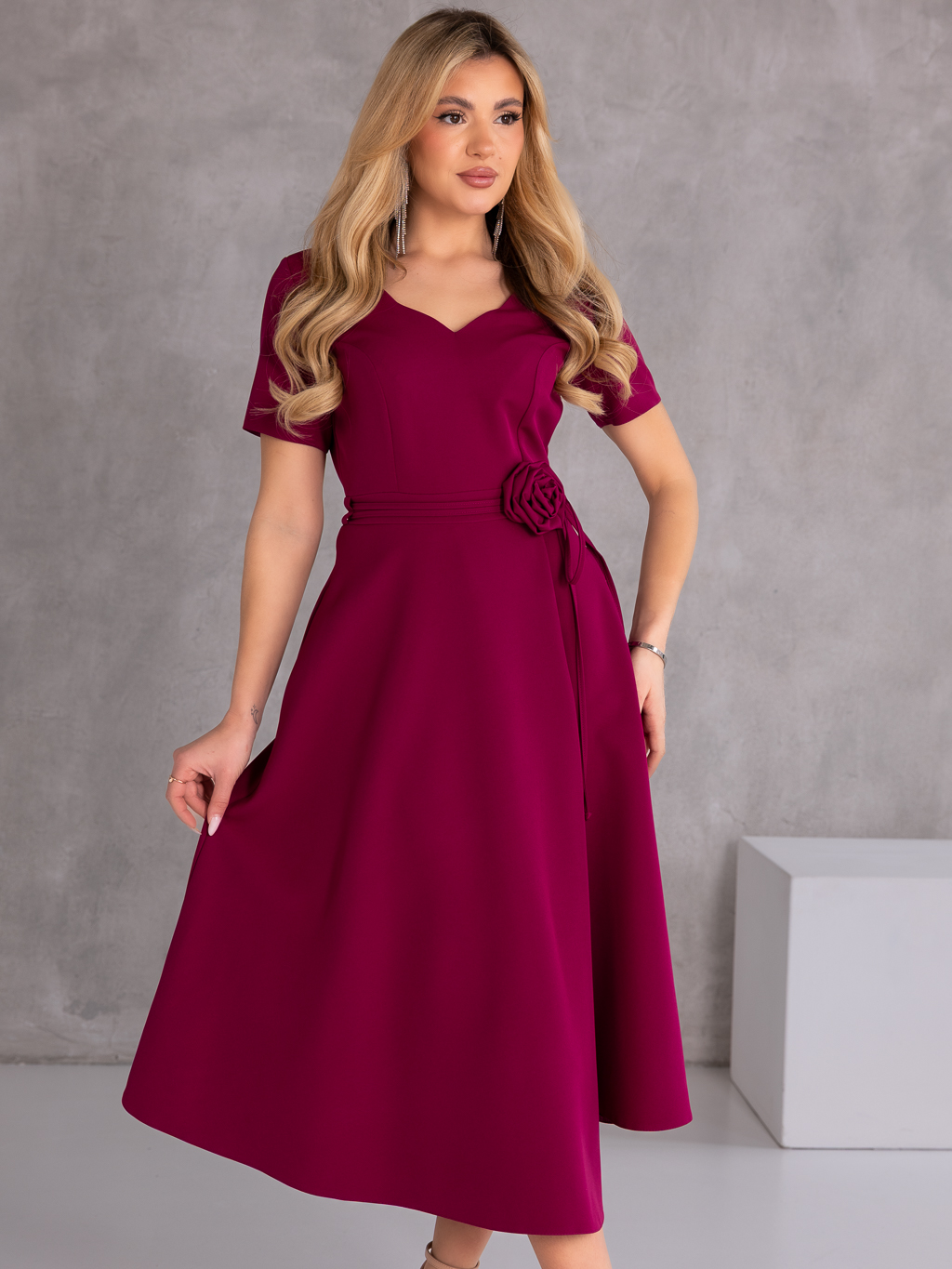 Elegancka sukienka midi, która zachwyca kobiecym fasonem i stylowymi detalami. Model posiada dekolt w literę V, który subtelnie podkreśla szyję i optycznie wysmukla sylwetkę. Wiązanie w talii pięknie akcentuje kobiece kształty, a dekoracyjna róża dodaje całości wyjątkowego i eleganckiego charakteru. Krótki rękawek sprawia, że sukienka doskonale sprawdzi się podczas cieplejszych dni i uroczystości. Model wyposażony jest w praktyczne kieszenie oraz zamek z tyłu, który ułatwia zakładanie.