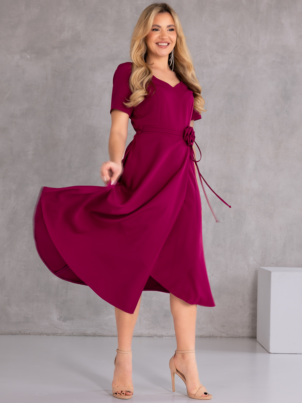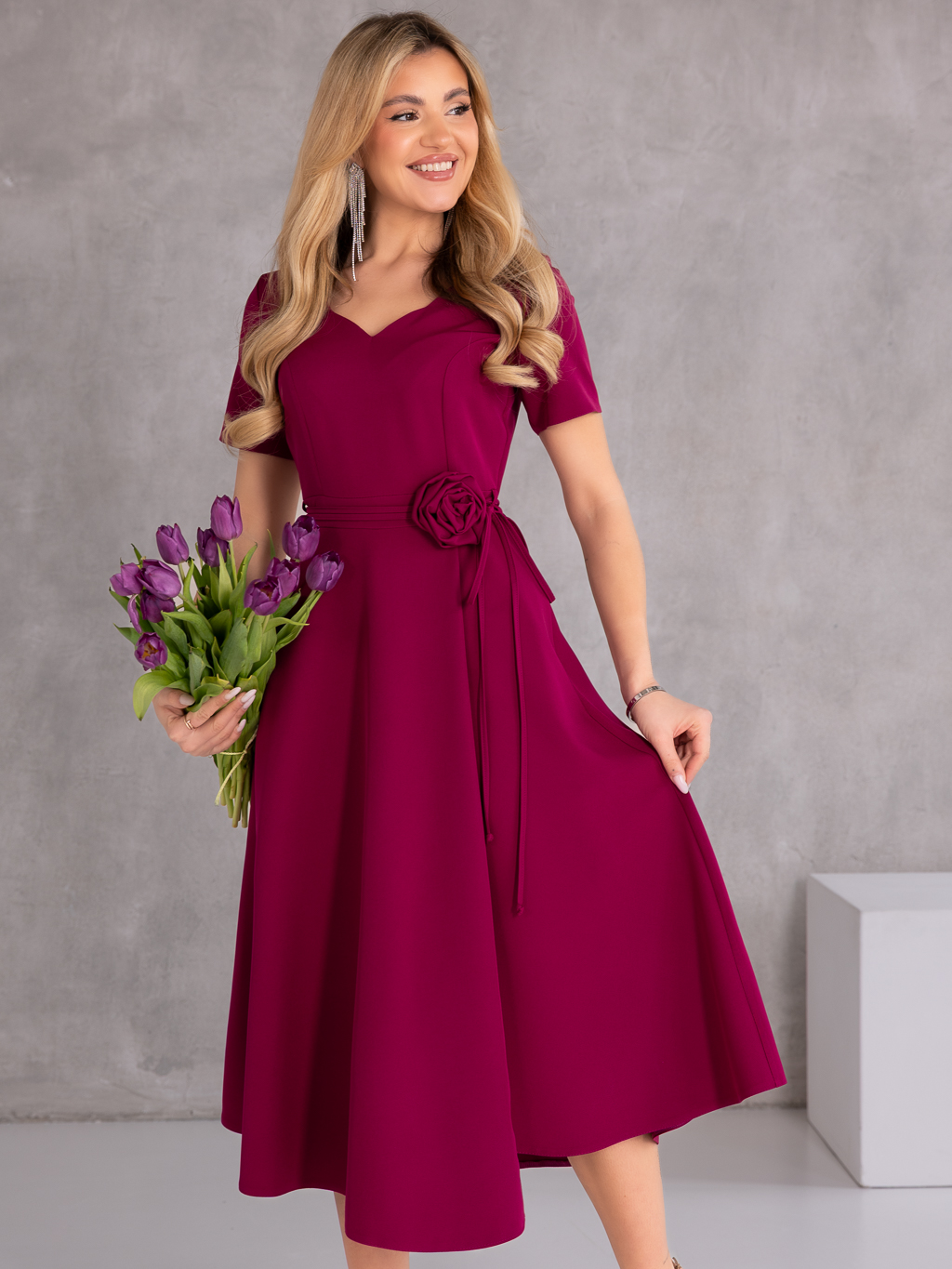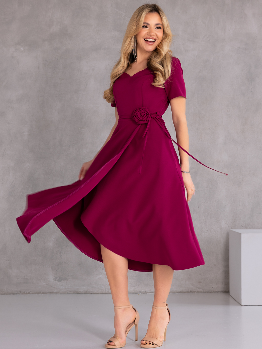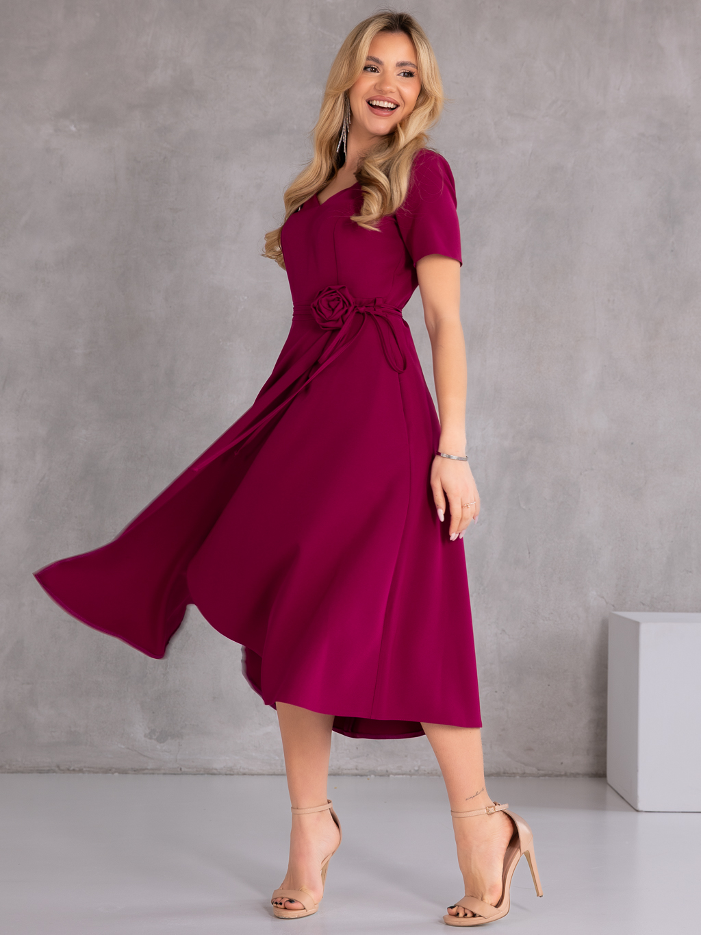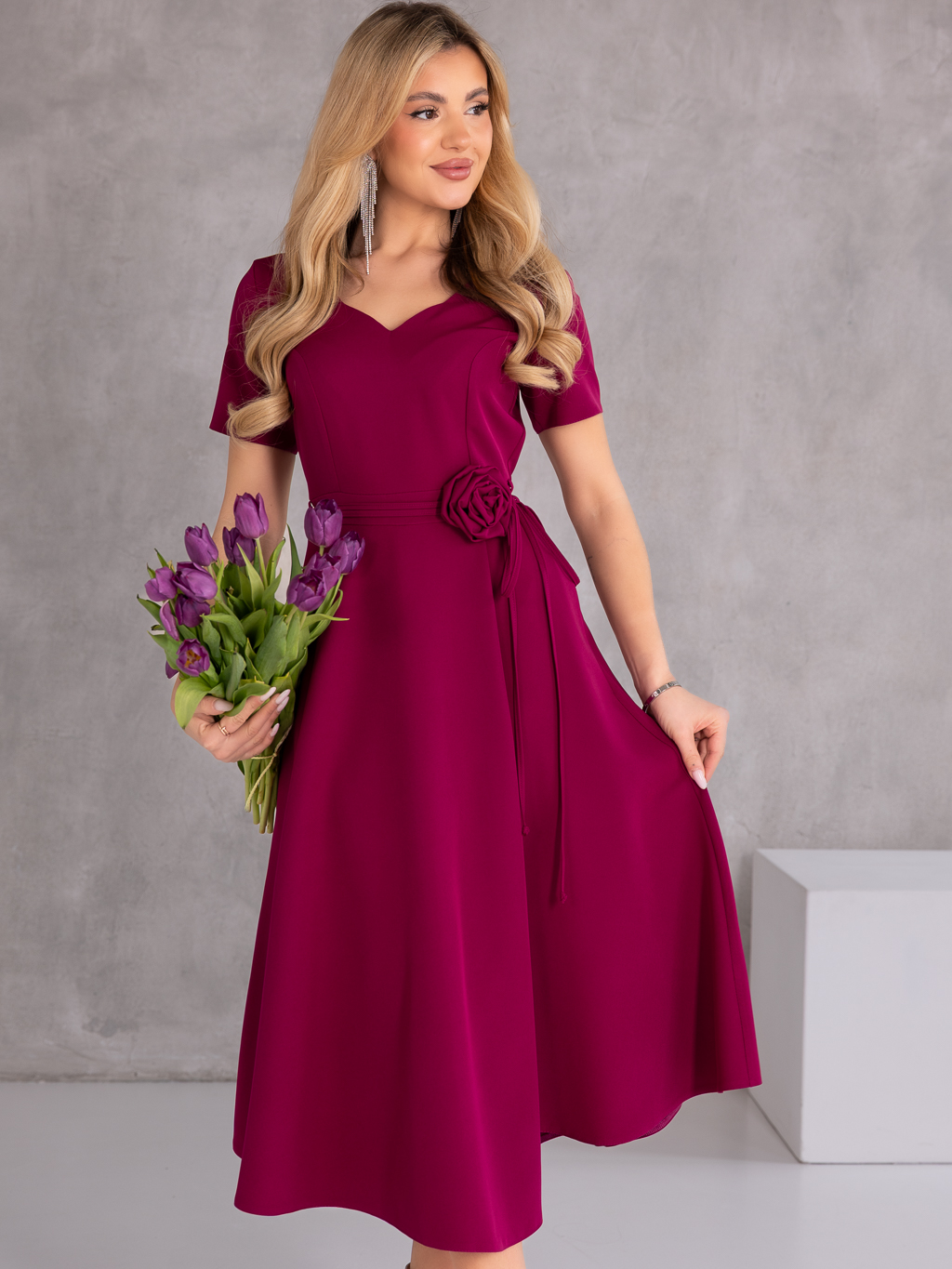 Elegancka sukienka midi, która zachwyca kobiecym fasonem i stylowymi detalami. Model posiada dekolt w literę V, który subtelnie podkreśla szyję i optycznie wysmukla sylwetkę. Wiązanie w talii pięknie akcentuje kobiece kształty, a dekoracyjna róża dodaje całości wyjątkowego i eleganckiego charakteru. Krótki rękawek sprawia, że sukienka doskonale sprawdzi się podczas cieplejszych dni i uroczystości. Model wyposażony jest w praktyczne kieszenie oraz zamek z tyłu, który ułatwia zakładanie.