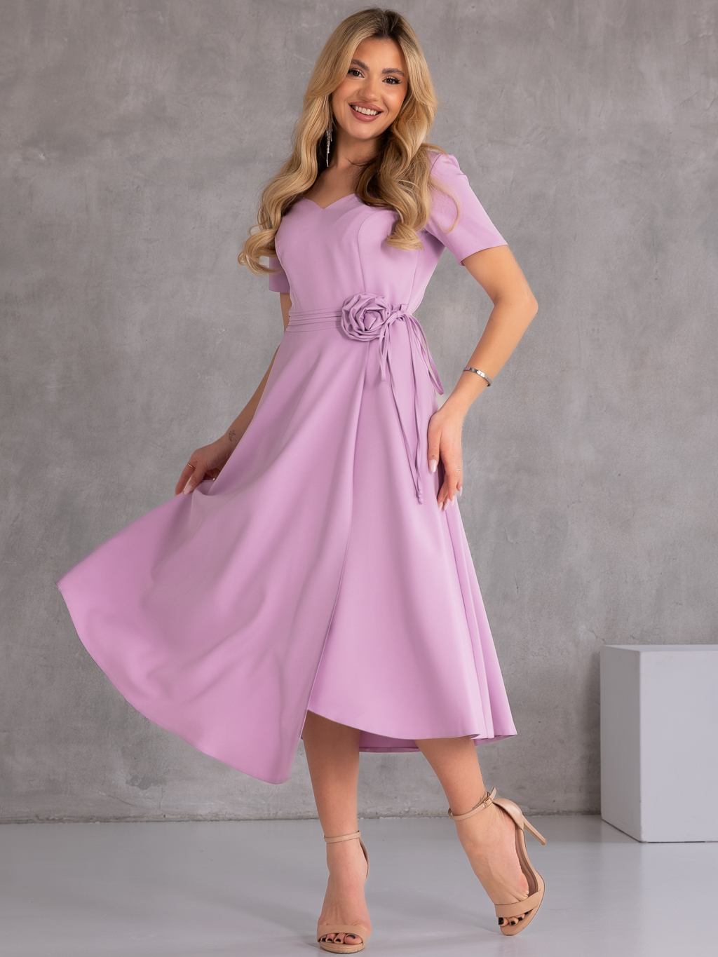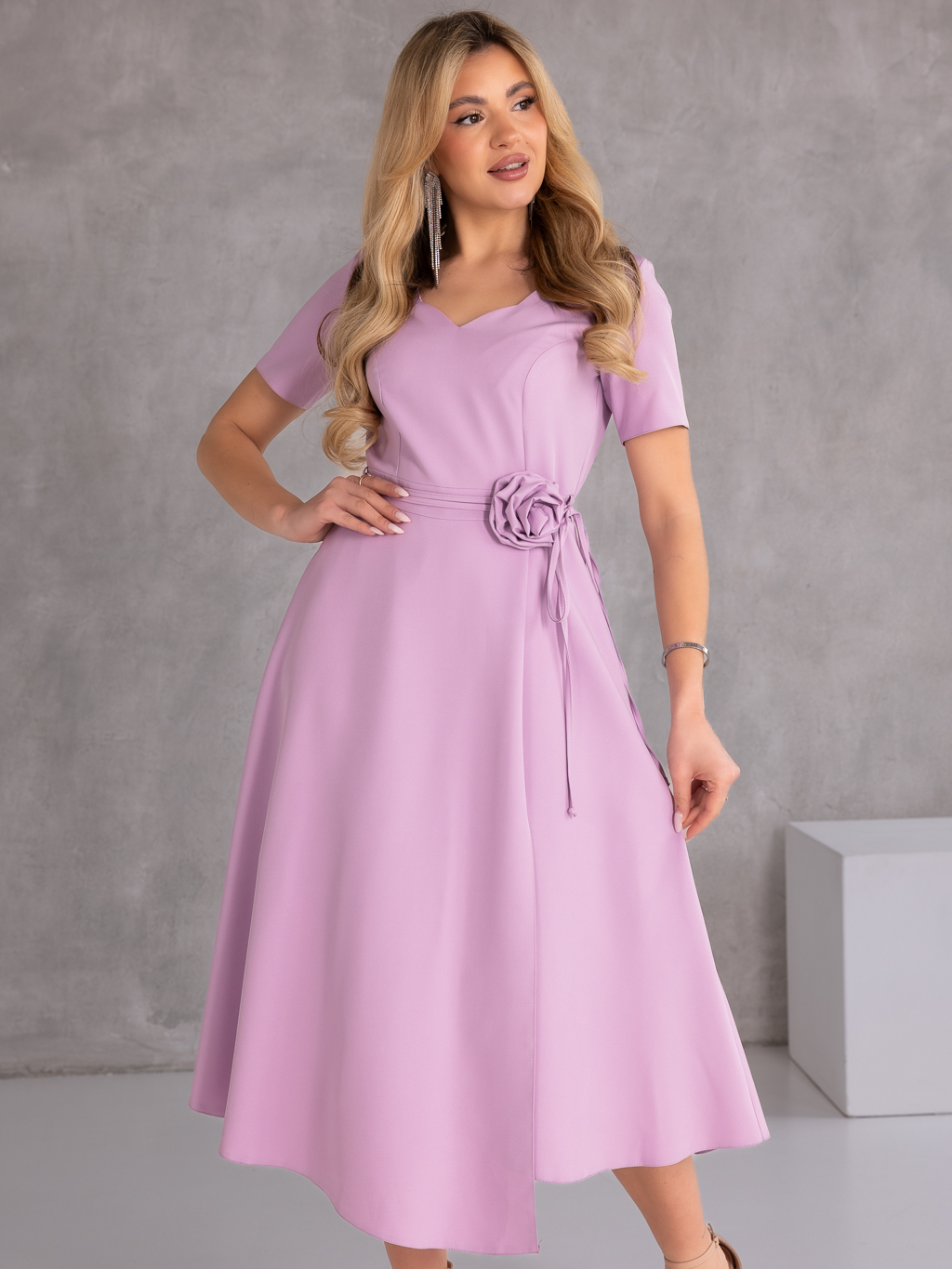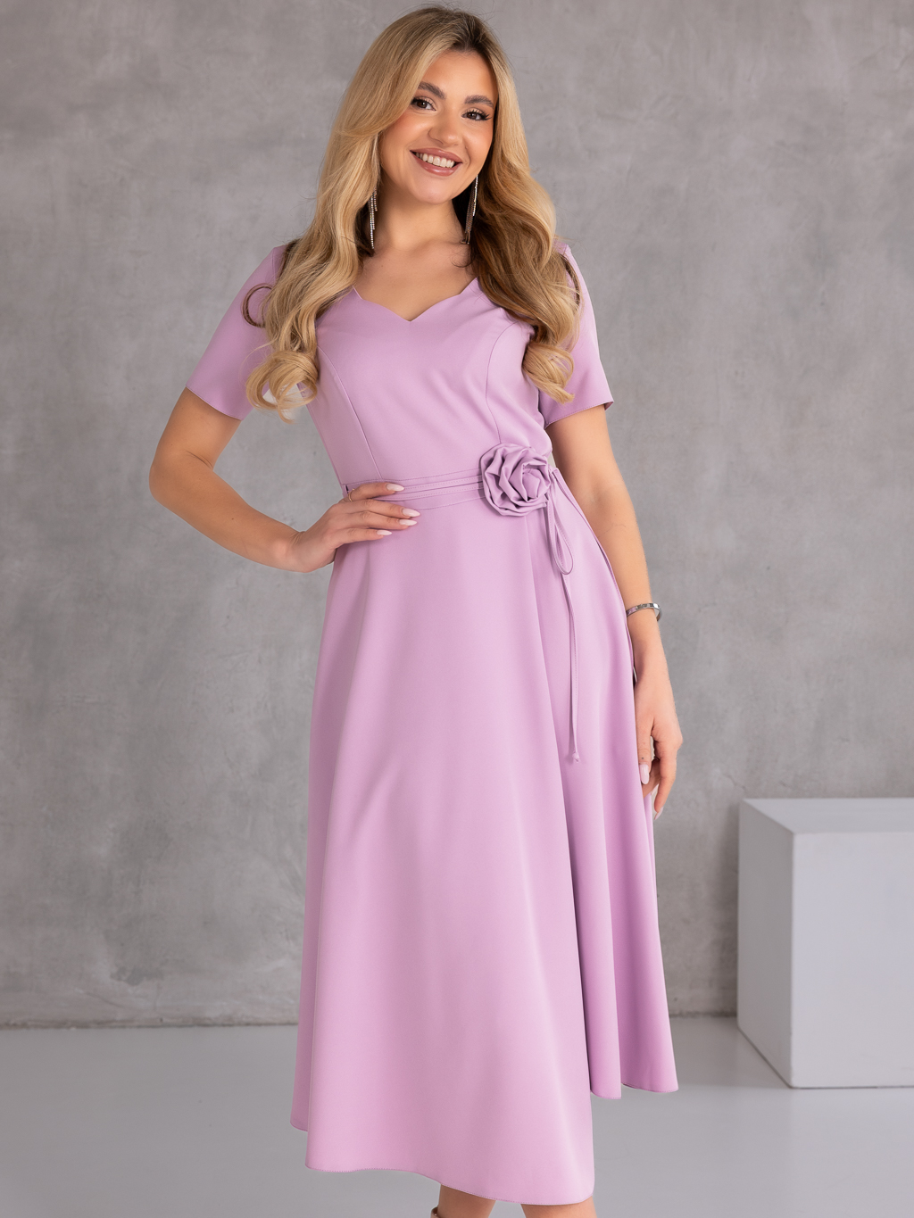 Elegancka sukienka midi, która zachwyca kobiecym fasonem i stylowymi detalami. Model posiada dekolt w literę V, który subtelnie podkreśla szyję i optycznie wysmukla sylwetkę. Wiązanie w talii pięknie akcentuje kobiece kształty, a dekoracyjna róża dodaje całości wyjątkowego i eleganckiego charakteru. Krótki rękawek sprawia, że sukienka doskonale sprawdzi się podczas cieplejszych dni i uroczystości. Model wyposażony jest w praktyczne kieszenie oraz zamek z tyłu, który ułatwia zakładanie.