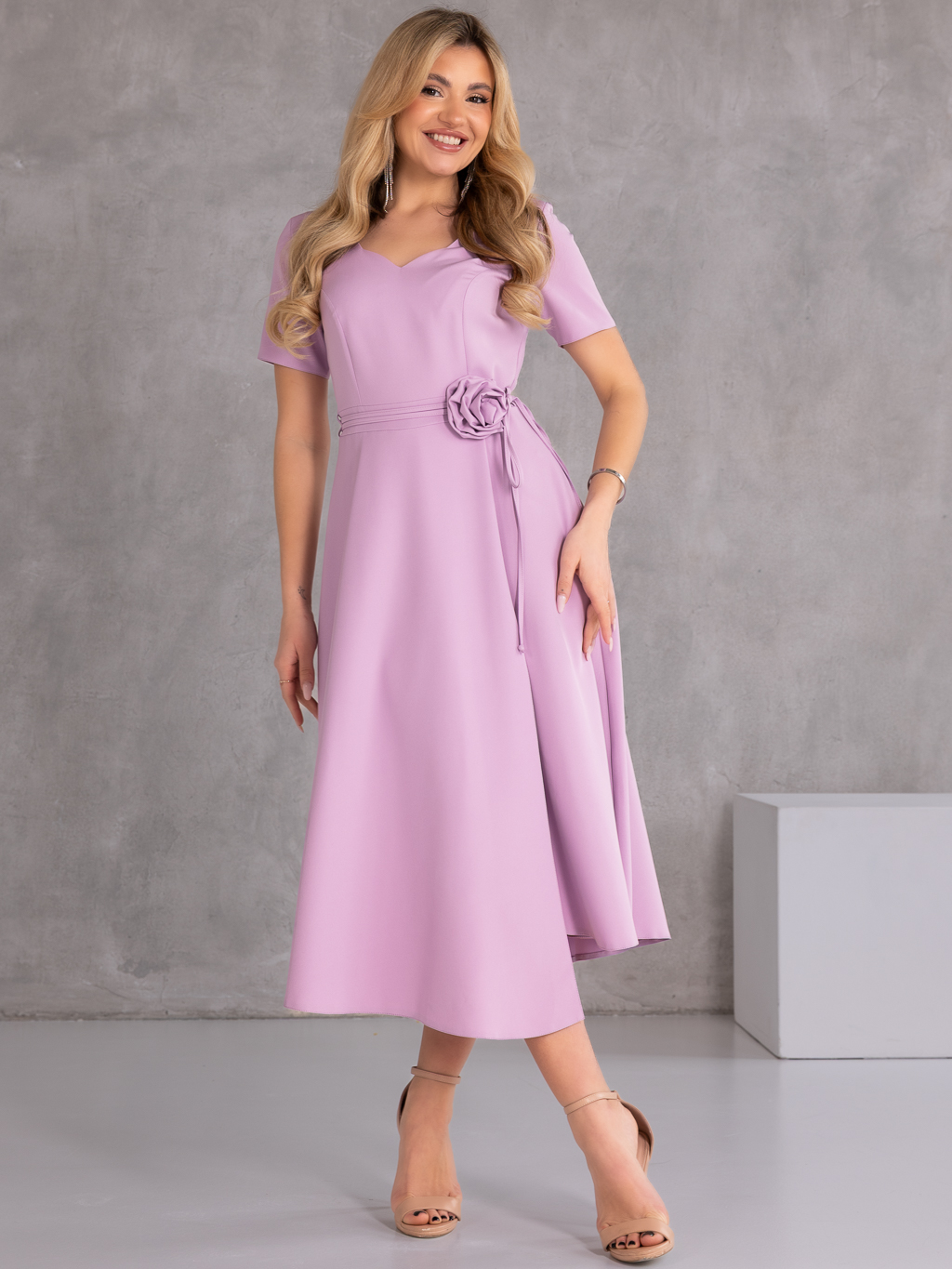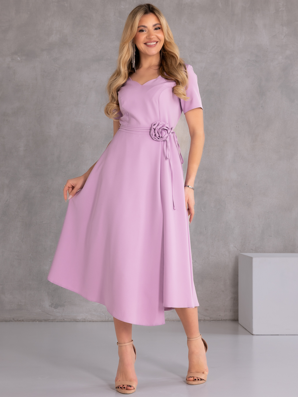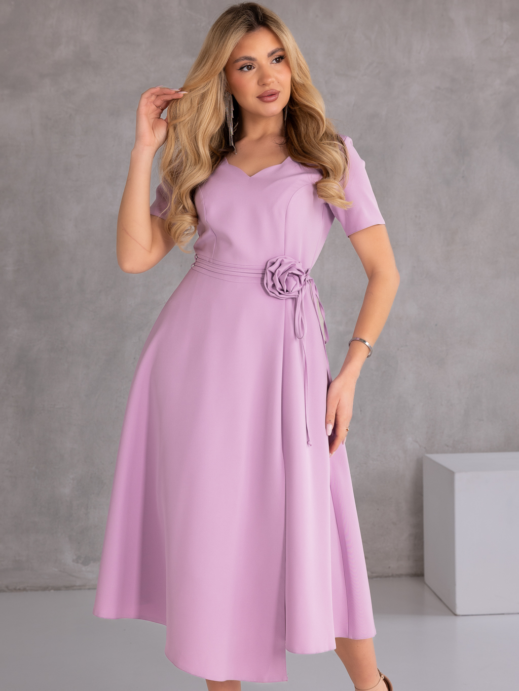Elegancka sukienka midi, która zachwyca kobiecym fasonem i stylowymi detalami. Model posiada dekolt w literę V, który subtelnie podkreśla szyję i optycznie wysmukla sylwetkę. Wiązanie w talii pięknie akcentuje kobiece kształty, a dekoracyjna róża dodaje całości wyjątkowego i eleganckiego charakteru. Krótki rękawek sprawia, że sukienka doskonale sprawdzi się podczas cieplejszych dni i uroczystości. Model wyposażony jest w praktyczne kieszenie oraz zamek z tyłu, który ułatwia zakładanie.