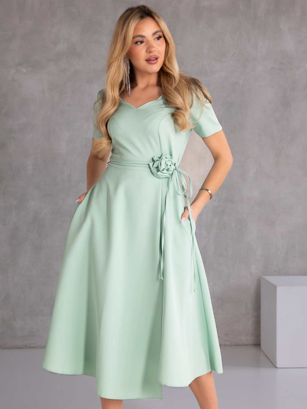 Elegancka sukienka midi, która zachwyca kobiecym fasonem i stylowymi detalami. Model posiada dekolt w literę V, który subtelnie podkreśla szyję i optycznie wysmukla sylwetkę. Wiązanie w talii pięknie akcentuje kobiece kształty, a dekoracyjna róża dodaje całości wyjątkowego i eleganckiego charakteru. Krótki rękawek sprawia, że sukienka doskonale sprawdzi się podczas cieplejszych dni i uroczystości. Model wyposażony jest w praktyczne kieszenie oraz zamek z tyłu, który ułatwia zakładanie.