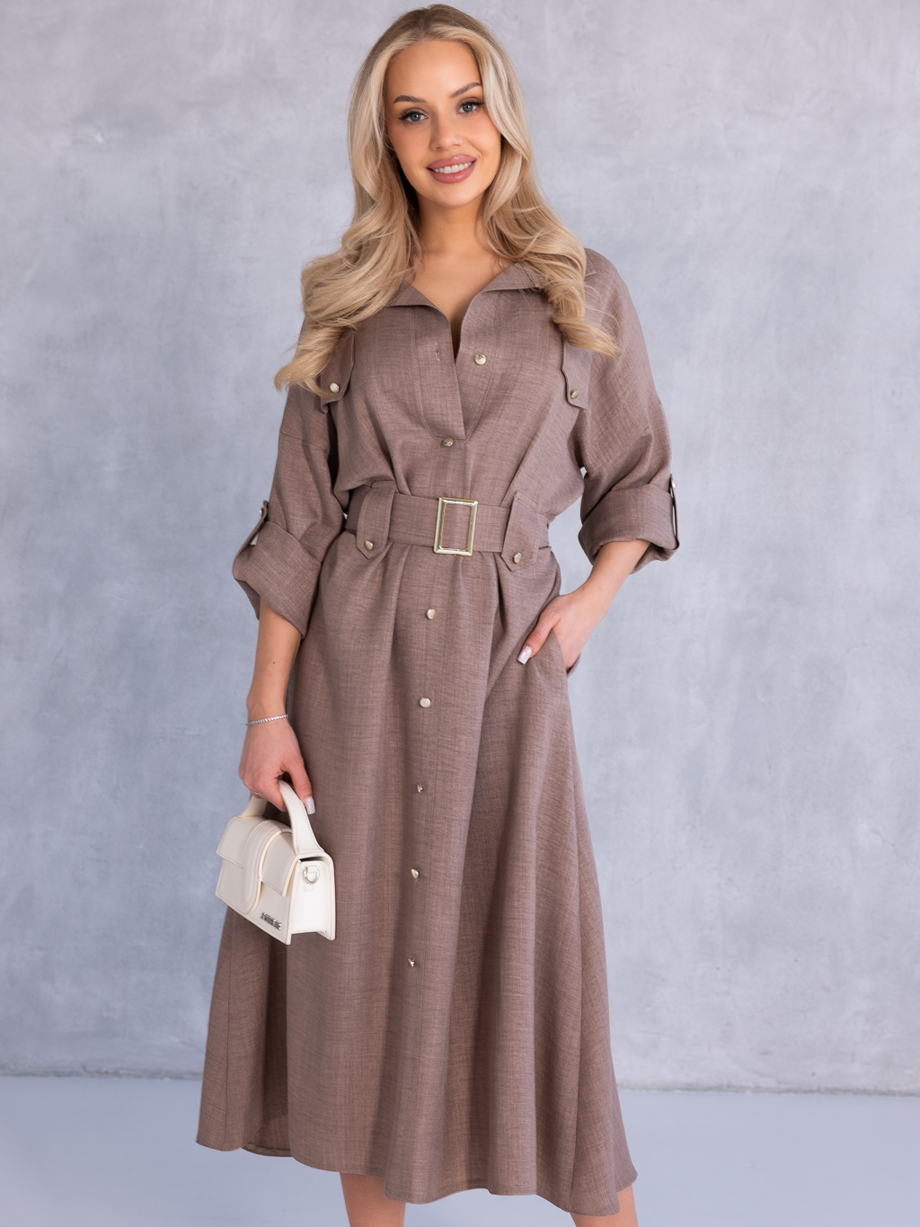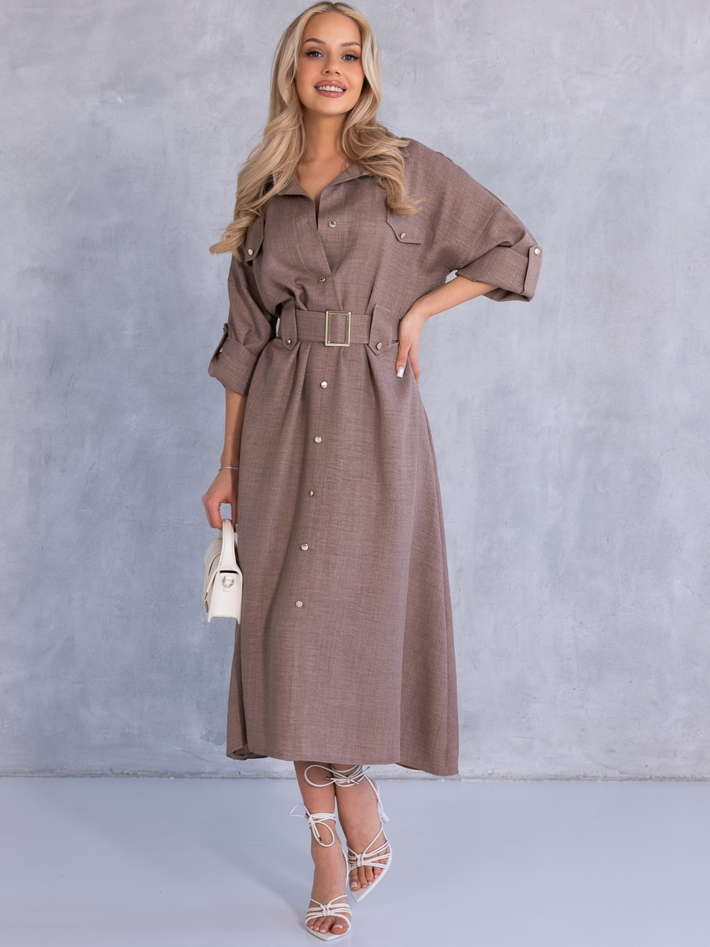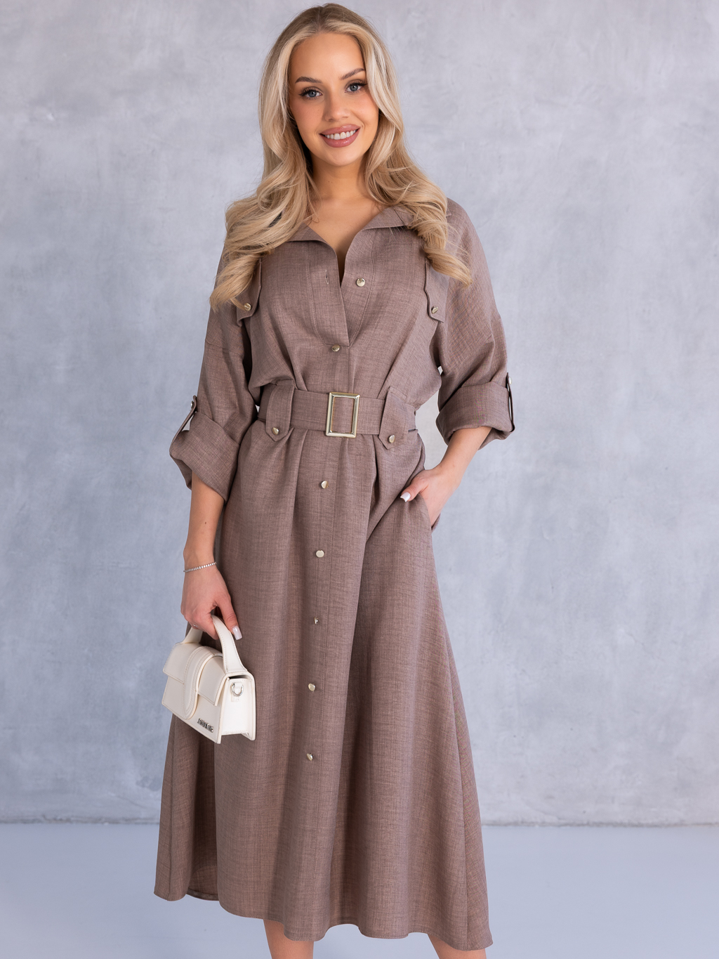Stylowa sukienka koszulowa o luźnym i wygodnym fasonie, która doskonale sprawdzi się w codziennych oraz bardziej eleganckich stylizacjach. Model łączy klasyczny charakter z kobiecymi detalami, zapewniając komfort noszenia i ponadczasowy wygląd. Sukienka posiada rękawy o długości 3/4 z możliwością podpięcia, co dodaje jej swobodnego stylu i pozwala dopasować fason do okazji. Pasek pięknie podkreśla talię, nadając sylwetce proporcji i kobiecego charakteru. Guziki przy dekolcie są odpinane, co ułatwia zakładanie i pozwala regulować głębokość dekoltu, natomiast pozostałe guziki na długości sukienki pełnią funkcję dekoracyjną, podkreślając koszulowy styl modelu.