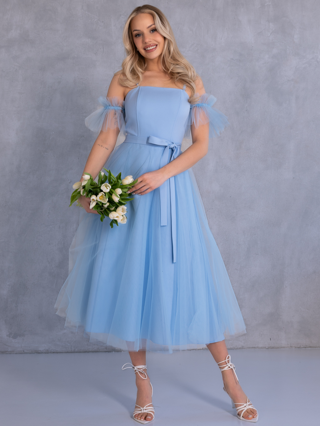 Model posiada cienkie ramiączka oraz subtelne, tiulowe bufki na ramionach, które nadają całości lekkości i wyjątkowego uroku. Rozkloszowany, bujny dół z warstwy tiulu tworzy spektakularny efekt podczas ruchu, a długość midi dodaje elegancji i sprawia, że sukienka idealnie sprawdzi się na wyjątkowe okazje.