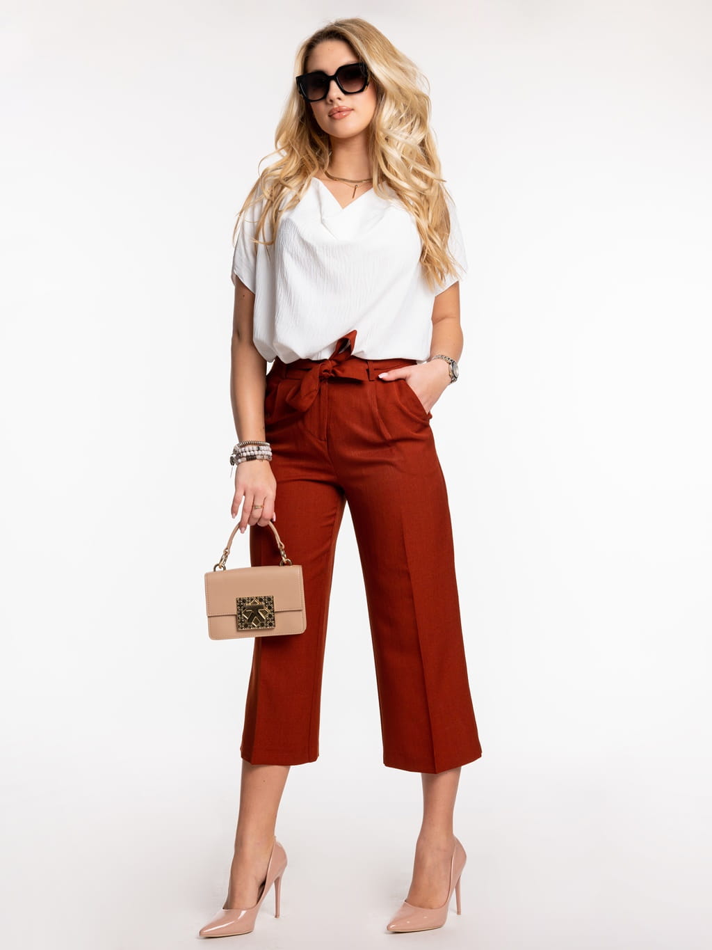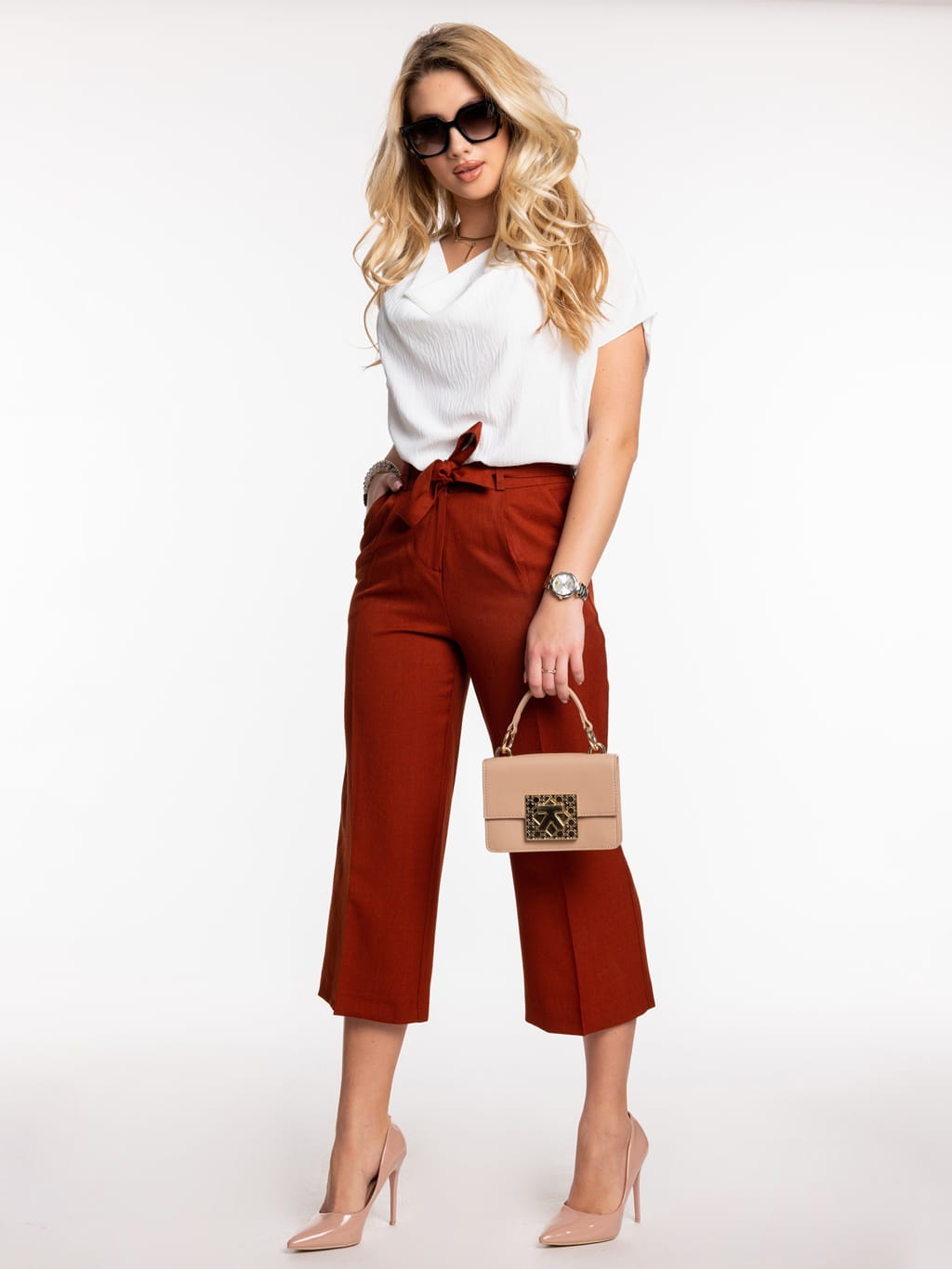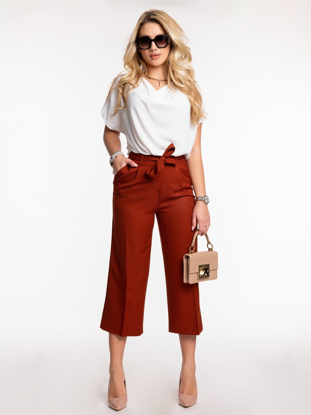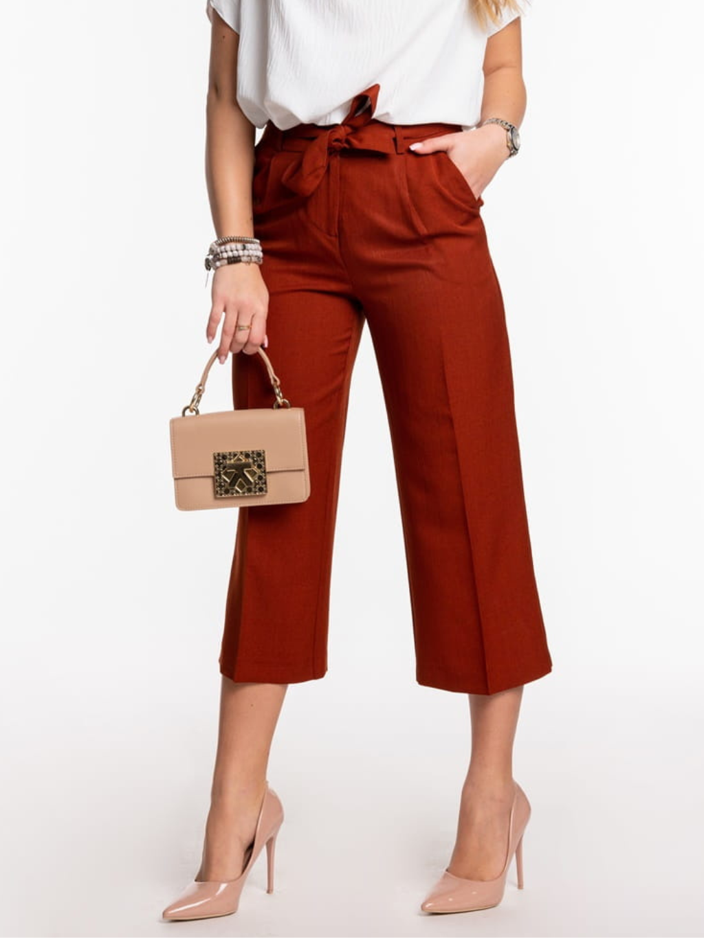 Elegancki, modne gładkie spodnie rybaczki culloty damskie. Spodnie posiadają stan wysoki oraz dwie kieszenie z przodu. Dodatkowo rybaczki posiadają materiałowy pasek.