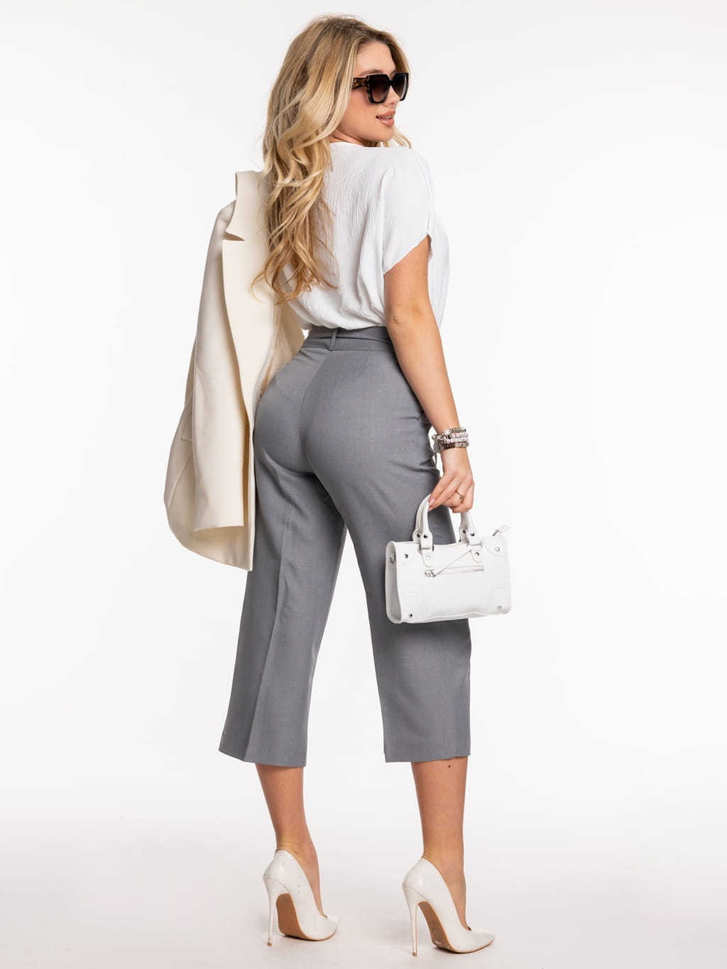 Elegancki, modne gładkie spodnie rybaczki culloty damskie. Spodnie posiadają stan wysoki oraz dwie kieszenie z przodu. Dodatkowo rybaczki posiadają materiałowy pasek.