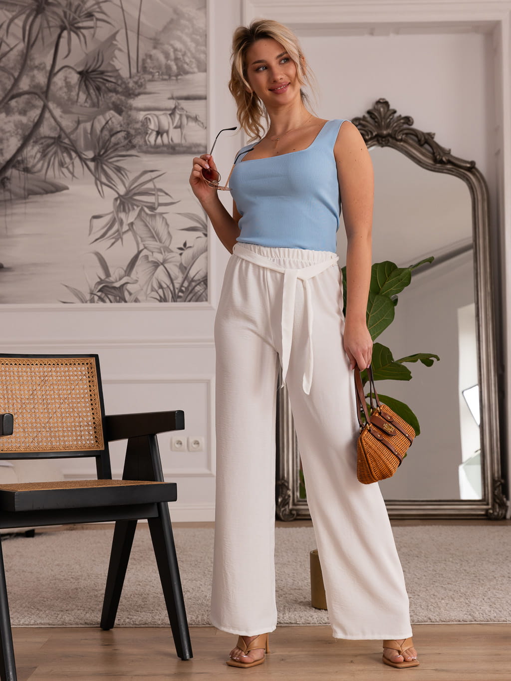 Casualowe spodnie materiałowe, idealne na ciepłe dni. Charakteryzują się luźnym, zwiewnym krojem z szerokimi nogawkami, które zapewniają komfort i swobodę ruchów. Wysoki stan podkreśla sylwetkę, a gumka w pasie gwarantuje wygodę noszenia. Doskonały wybór na codzienne stylizacje, które łączą elegancję z luzem.